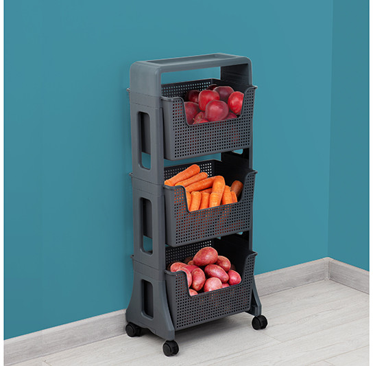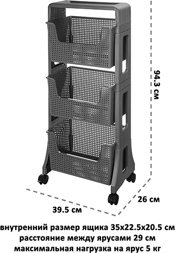 Напольная трёхъярусная этажерка El Casa «Лофт» размером на колесах с фиксаторами поможет создать порядок и организовать систему хранения в вашем доме. Этажерка выполнена из полипропилена. Этот материал безопасней других видов пластика, так как не содержит бисфенол А и других вредных веществ. Внутренний размер ящика — 35 × 22,5 × 20,5 см, расстояние между ярусами — 29 см, максимальная нагрузка на один ящик — 5 кг.