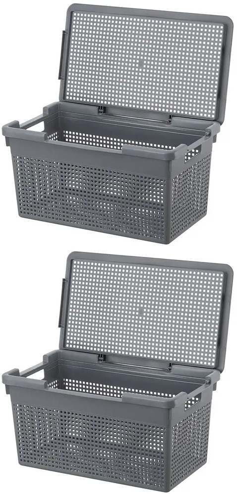 В состав набора входят две корзины с крышками объемом 21 литр, размер каждой 45,5 × 26,5 × 23,5 см (дно 40,5 × 21,5 см). Органайзеры выполнены из полипропилена. Преимущество данного материала над обычным пластиком в том, что он легкий по весу и наиболее безопасный для здоровья. В универсальном контейнере серого цвета можно хранить как овощи и фрукты, так и кухонные и хозяйственные принадлежности. Используйте ёмкость для косметики, бытовой химии, моющих средств. Специальное плетение с дырочками позволяет воздуху проникать внутрь и не дает продуктам испортиться от недостатка кислорода. Корзина может быть использована для белья, полотенец и хранения различных мелочей. Такую подставку можно поставить под раковину в ванной, возле стиральной машины или на полку. Ящички можно хранить компактно — один на другом. Используйте в детской комнате как стеллаж или ящик для игрушек. Товары представлены разных объемов, форм и расцветок, что позволит собрать уникальный набор, подходящий под ваши потребности.