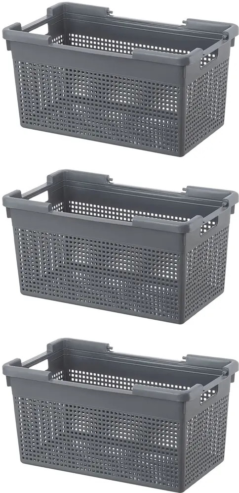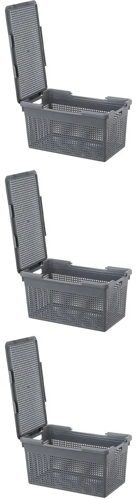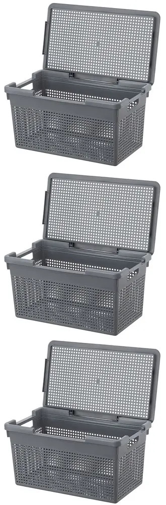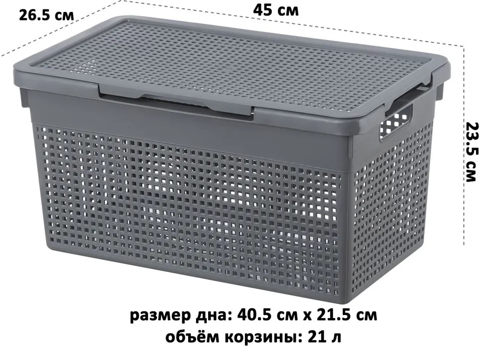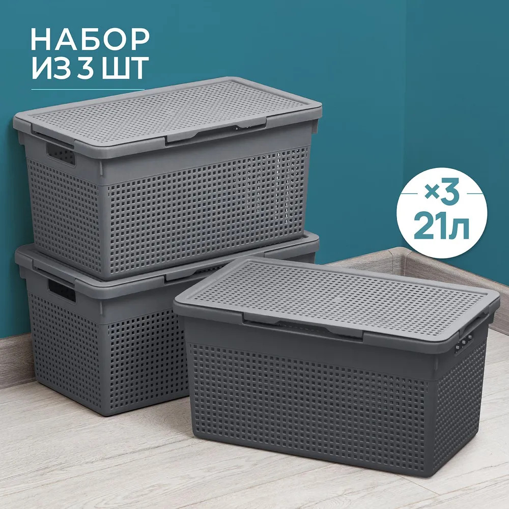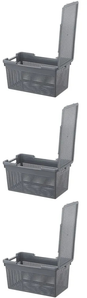 В состав набора входят три корзины с крышками объемом 21 литр, размер каждой 45,5 × 26,5 × 23,5 см (дно 40,5 × 21,5 см). Органайзеры выполнены из полипропилена. Преимущество данного материала над обычным пластиком в том, что он легкий по весу и наиболее безопасный для здоровья. В универсальном контейнере серого цвета можно хранить как овощи и фрукты, так и кухонные и хозяйственные принадлежности. Используйте ёмкость для косметики, бытовой химии, моющих средств. Специальное плетение с дырочками позволяет воздуху проникать внутрь и не дает продуктам испортиться от недостатка кислорода. Корзина может быть использована для белья, полотенец и хранения различных мелочей. Такую подставку можно поставить под раковину в ванной, возле стиральной машины или на полку. Ящички можно хранить компактно — один на другом. Используйте в детской комнате как стеллаж или ящик для игрушек. Товары представлены разных объемов, форм и расцветок, что позволит собрать уникальный набор, подходящий под ваши потребности.