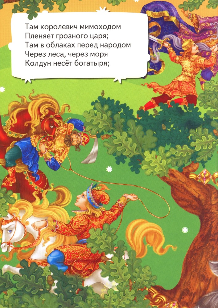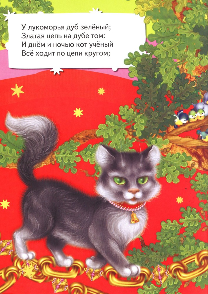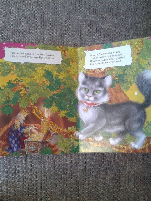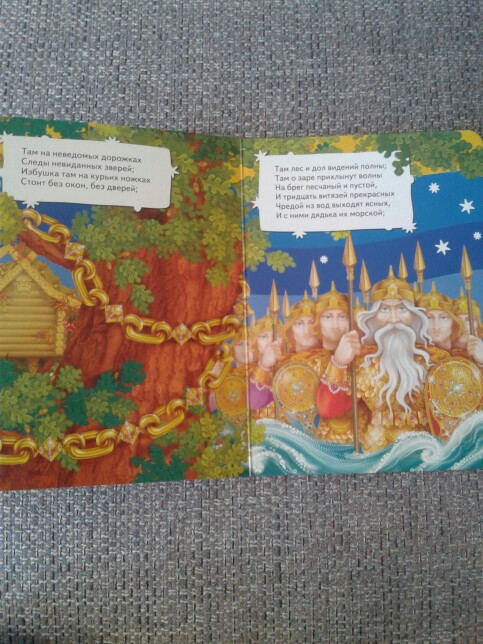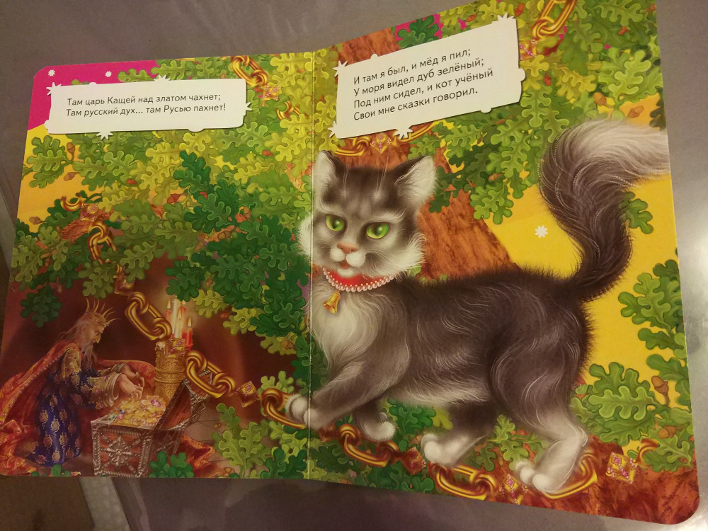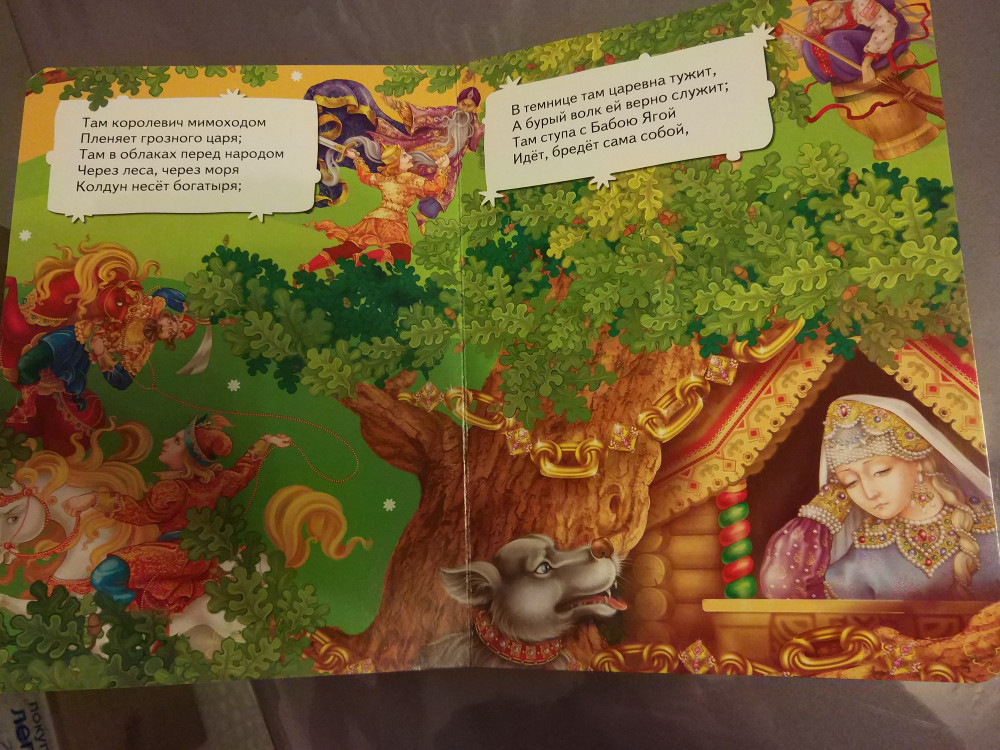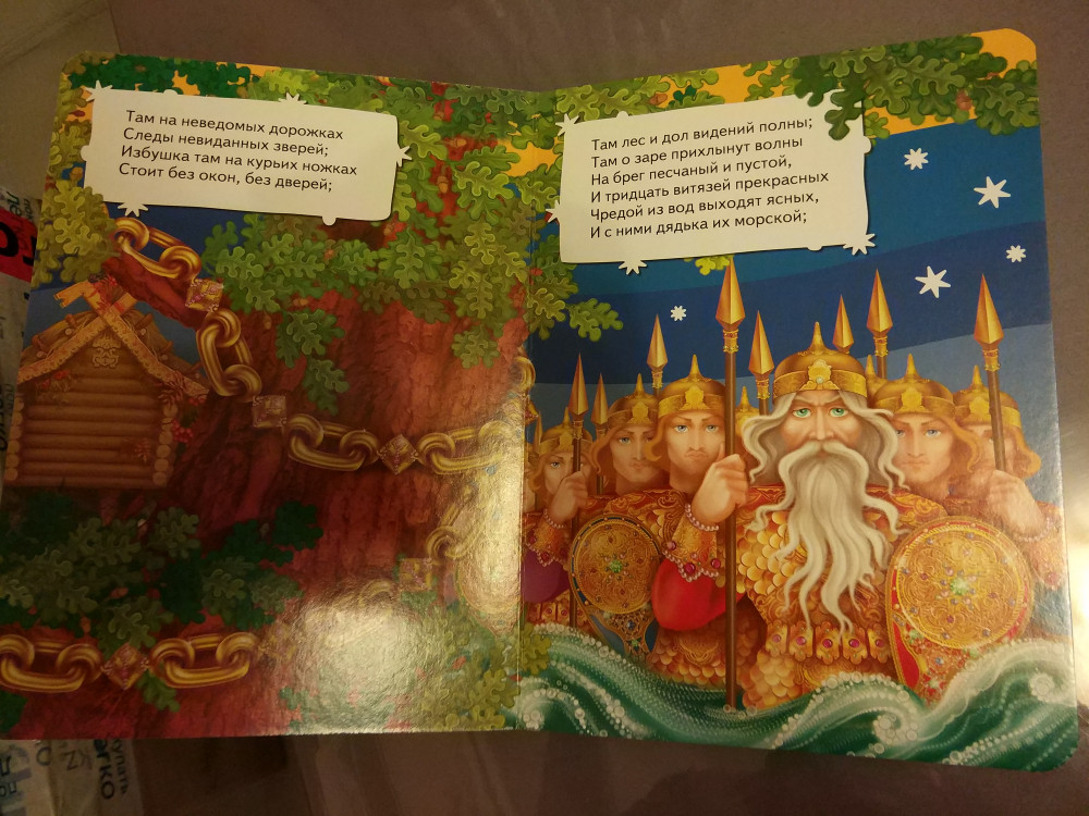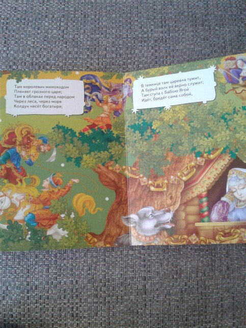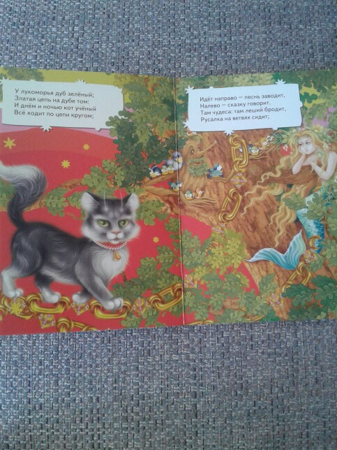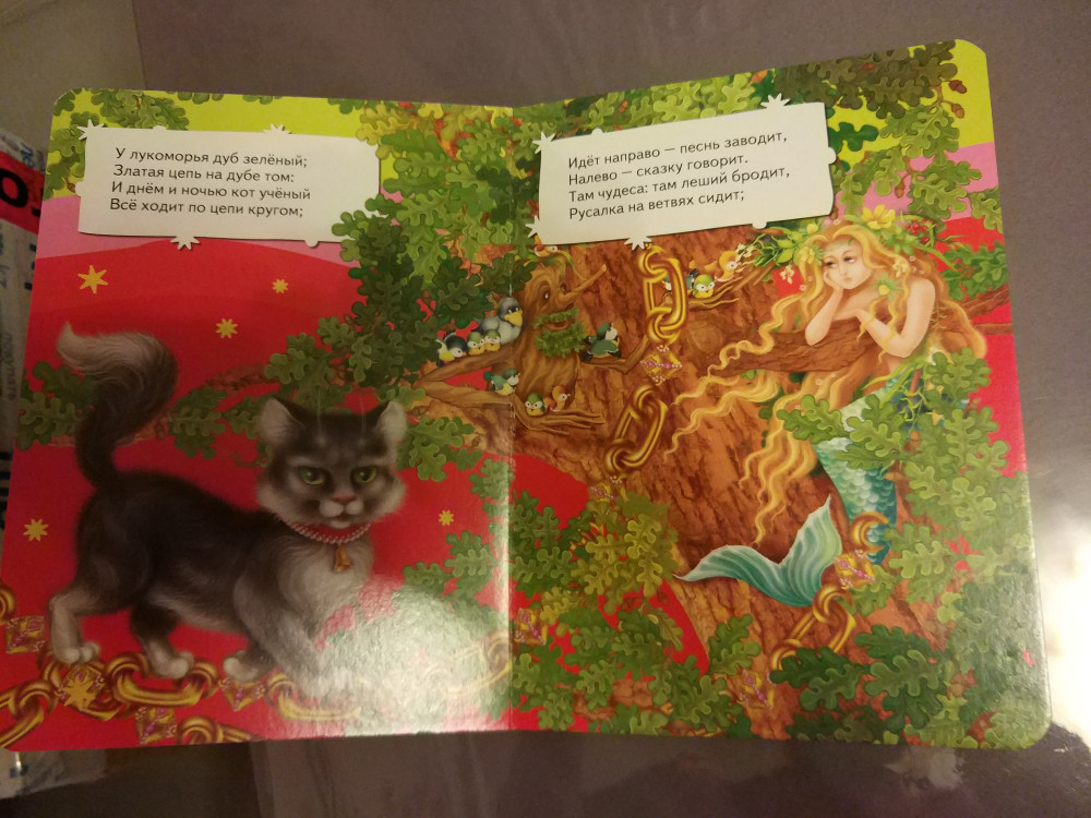 Моему ребёнку почти все цветные книги нравятся. Но вот мне нет, особенно эта. По Лукоморью такие иллюстрации можно сделать шикарные, но тут у меня впечатление как от халтуры: один и тот же штампованный кот едва ли не на половине страниц, и не менее штампованный дуб невзрачным фоном. Хотя сын (1,9) часто слушает, любит лешего, витязей и ступу. Но, думаю, это заслуга текста, а не издателей.