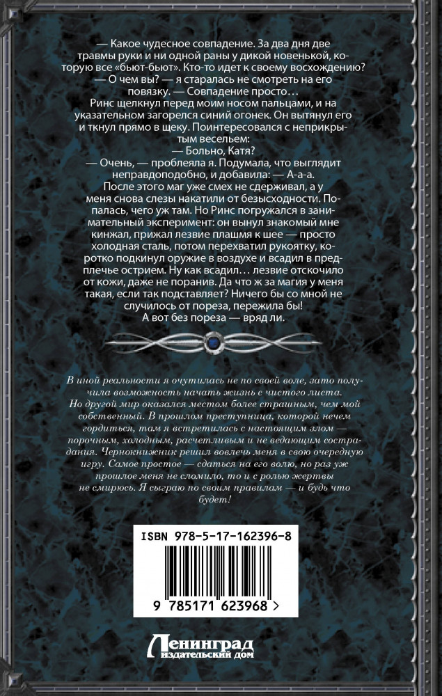 Серия: Другие миры В иной реальности я очутилась не по своей воле, зато получила возможность начать жизнь с чистого листа. Но другой мир оказался местом более страшным, чем мой собственный. В прошлом преступница, которой нечем гордиться, там я встретилась с настоящим злом — порочным, холодным, расчетливым и не ведающим сострадания. Чернокнижник решил вовлечь меня в свою очередную игру. Самое простое — сдаться на его волю, но раз уж прошлое меня не сломило, то и с ролью жертвы не смирюсь. Я сыграю по своим правилам — и будь что будет! |