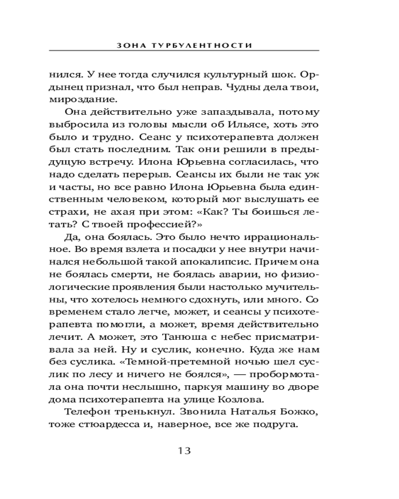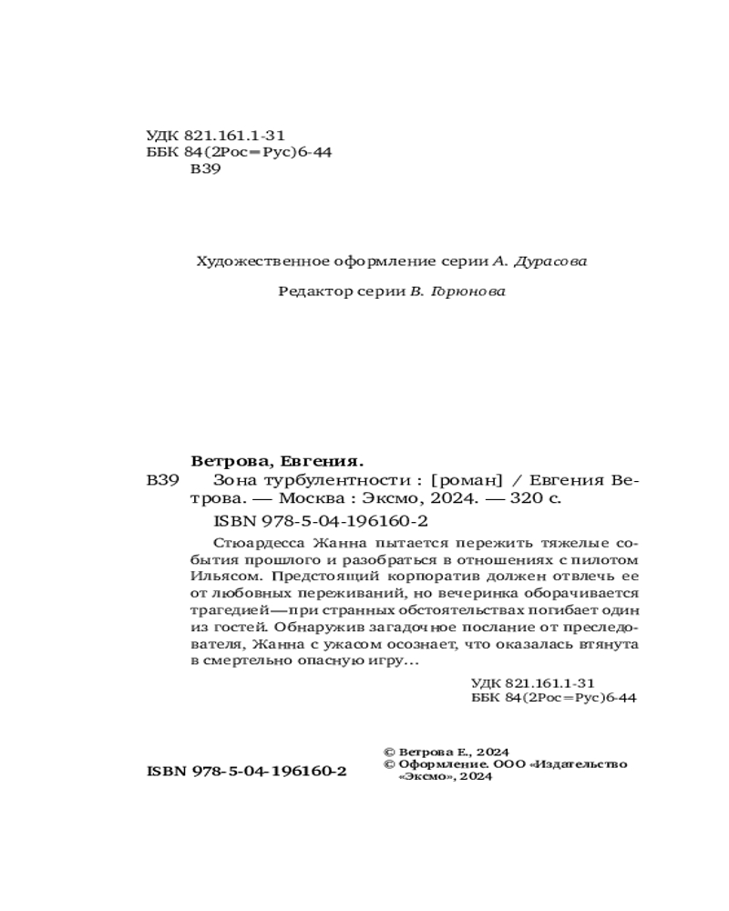 Зона турбулентностиВ данный момент этот товар отсутствует в продаже. Возможно, у нас найдется аналогичный или похожий товар здесь. Серия: Детектив высокого полета «Зона турбулентности» — это увлекательный детектив, в центре которого находится храбрая стюардесса Жанна. Ей предстоит столкнуться со многими трудностями, чтобы отыскать убийцу и спасти свою любовь. Сможет ли Жанна посмотреть своим страхам в лицо и победить их? |