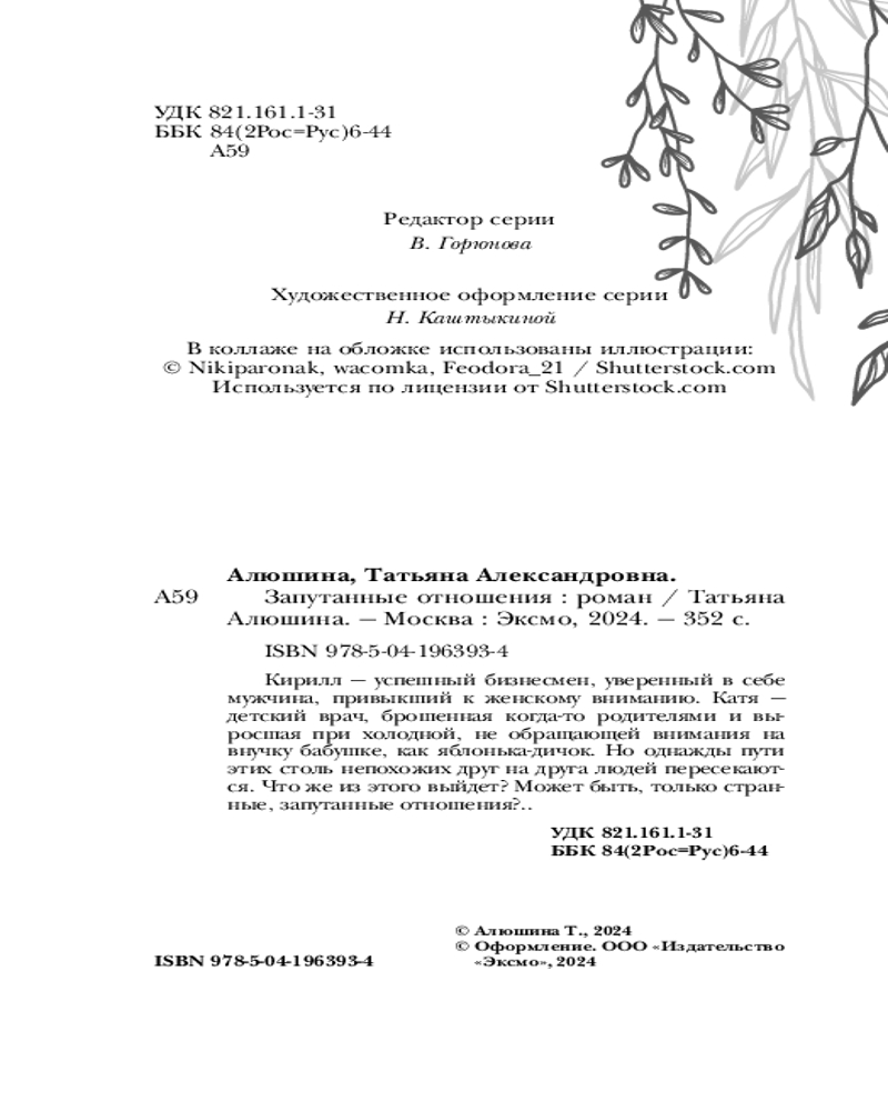 Серия: Еще раз про любовь. Романы Т. Алюшиной (подарочное издание) Романы Татьяны Алюшиной давно заслужили признание читательниц по всей стране, а суммарный тираж ее книг насчитывает более пяти миллионов! Захватывающие сюжеты, незабываемые чувства и подлинная страсть — ее книги читаются на одном дыхании и снова помогают поверить: счастье есть! Кирилл — успешный бизнесмен, уверенный в себе мужчина, привыкший к женскому вниманию. Катя — детский врач, брошенная когда-то родителями и выросшая при холодной, не обращающей внимания на внучку бабушке, как яблонька-дичок. Но однажды пути этих столь непохожих друг на друга людей пересекаются. Что же из этого выйдет? Может быть, только странные, запутанные отношения?.. |