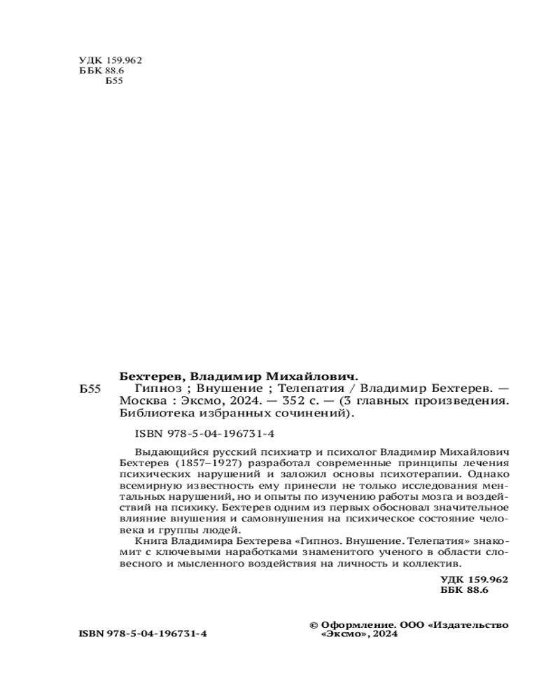 💳 Оплатить за товар можно при получении 🇰🇿 Есть бесплатная доставка по Казахстану 🎁 Копите бонусы с каждой покупки Серия: 3 главных произведения. Библиотека избранных сочинений Можно ли научиться читать мысли? Эффективен ли гипноз в лечении ментальных нарушений? Существуют ли психические эпидемии и какую роль сыграло внушение в известных исторических событиях? Откройте для себя скрытые возможности мозга с книгой «Владимир Бехтерев. Гипноз. Внушение. Телепатия». В сборник вошли ключевые работы выдающегося русского ученого, врача-психиатра и психолога Владимира Михайловича Бехтерева (1857–1927), посвященные вопросам воздействия на человека и группу людей. Ученый исследовал причины возникновения и способы лечения галлюцинаций, иллюзий, массовых психозов. Изучал возможности словесного и мысленного воздействия на людей, феномен чтения мыслей, телепатии. Анализировал психологию толпы и качества лидера, способного вести за собой. |