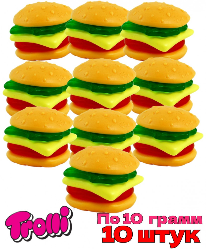 Каждый мармеладный мини-бургер Trolli составлен из отдельных слоев жевательного мармелада: розовая котлета, сыр, зеленый лист салата и две румяные булочки. Составные части легко отделяются друг от друга и их можно пробовать в любом порядке. Все мега-бургеры Trolli имеют индивидуальную упаковку с логотипом Trolli.
