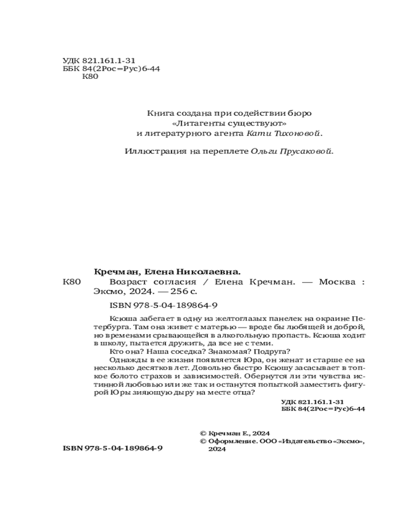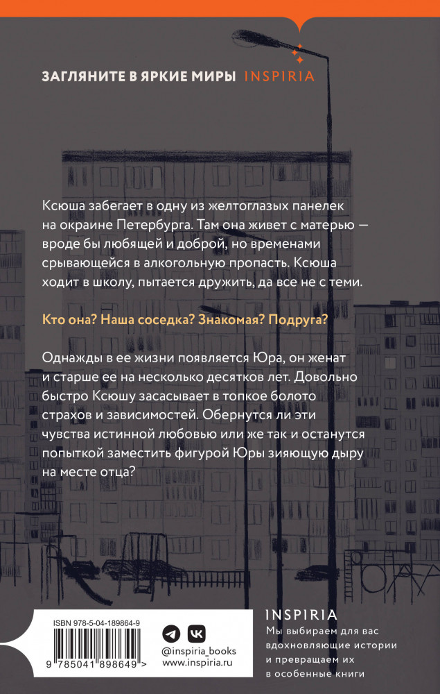 В данный момент этот товар отсутствует в продаже. Возможно, у нас найдется аналогичный или похожий товар здесь. Серия: Loft. Автофикшн Атмосферная история «Лолиты» из Петербурга нулевых понравится фанатам книг «Моя темная Ванесса», «Райский сад первой любви», «Сезон отравленных плодов». Ксюша забегает в одну из желтоглазых панелек на окраине Петербурга. Там она живет с матерью — вроде бы, любящей и доброй, но временами срывающейся в алкогольную пропасть. Ксюша ходит в школу, пытается дружить, да все не с теми.