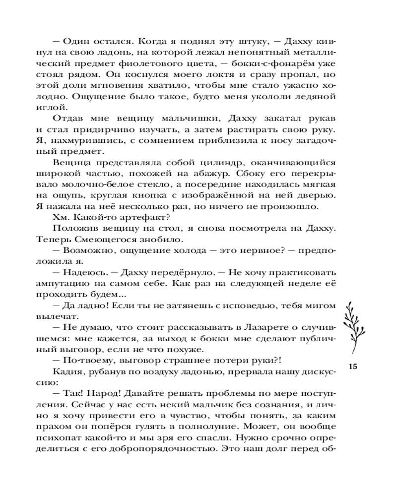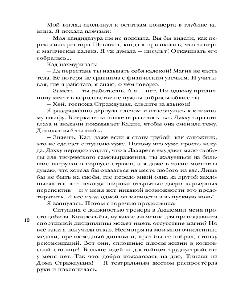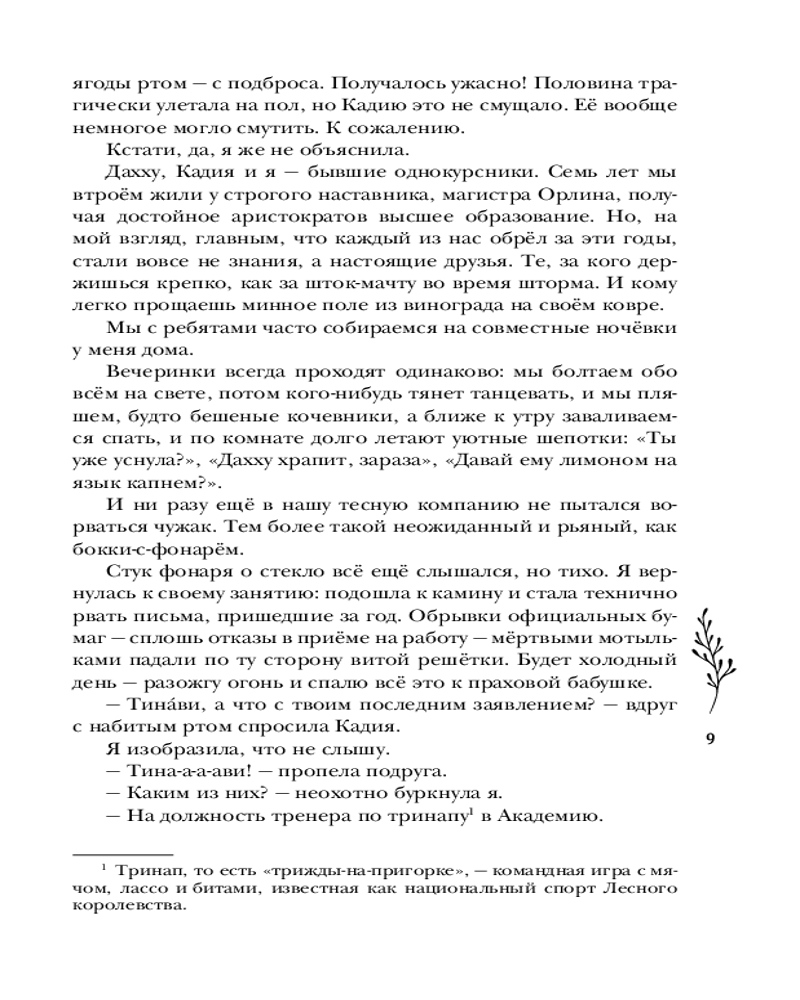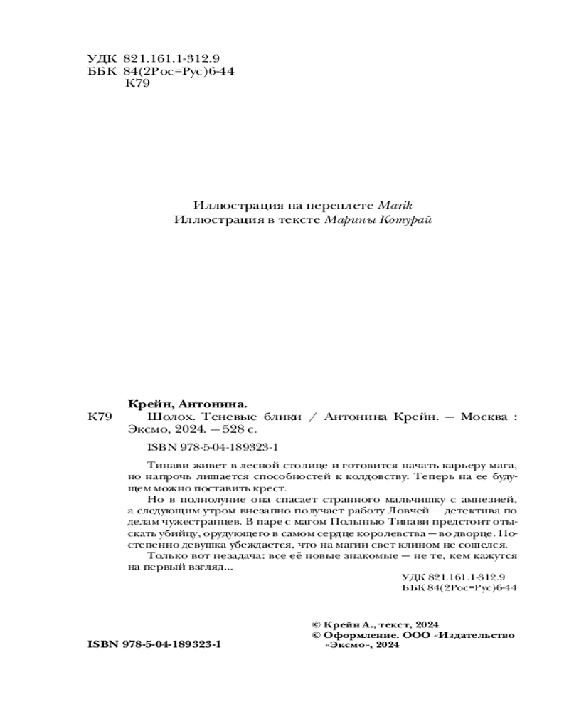 Серия: Young Adult. Книжный бунт. Фантастика (покет большого формата) Тинави живет в лесной столице и готовится начать карьеру мага, но напрочь лишается способностей к колдовству. Теперь на ее будущем можно поставить крест. Но в полнолуние она спасает странного мальчишку с амнезией, а следующим утром внезапно получает работу Ловчей — детектива по делам чужестранцев. В паре с магом Полынью Тинави предстоит отыскать убийцу, орудующего в самом сердце королевства — во дворце. Постепенно девушка убеждается, что на магии свет клином не сошелся. Только вот незадача: все её новые знакомые — не те, кем кажутся на первый взгляд... |