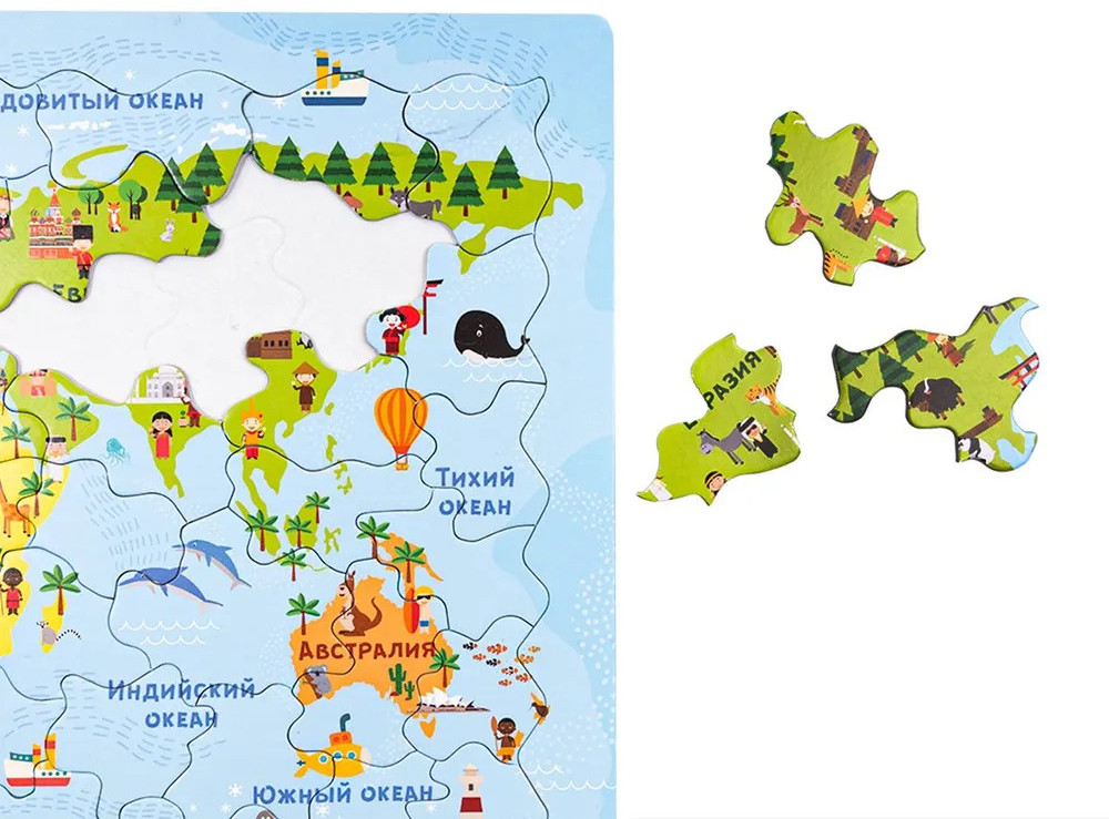 Обучающий планшетный пазл для детей «Карта мира» — это большой пазл из плотного картона, который собирается на специальном основании. На собранной картинке изображены океаны и континенты с человечками в национальных костюмах и животными, которые там обитают. |