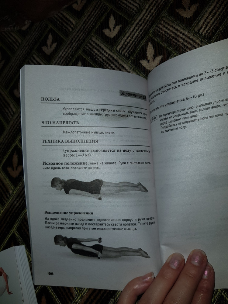 Хорошие упражнения! Делаю их каждый день поочередно как в книге, по нечетным дням - нечетные упражнения и наоборот. Если не пропускать и соблюдать требования как в книге, то помогают, и мышцы спины заметно крепнут! При начинающем сколиозе - очень полезная книга.