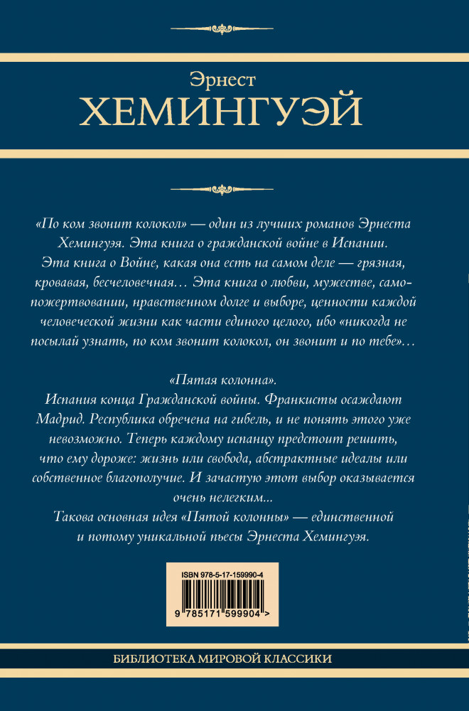 💳 Оплатить за товар можно при получении 🇰🇿 Есть бесплатная доставка по Казахстану 🎁 Копите бонусы с каждой покупки Серия: Neoclassic (Лучшее) Подарочное издание. Два произведения автора романов «Прощай, оружие» и «Старик и море» под одной обложкой. «Пятая колонна» — единственная пьеса Хемингуэя, а «По ком звонит колокол» — один из его самых известных романов. Эти произведения объединены темой Гражданской войны в Испании. |