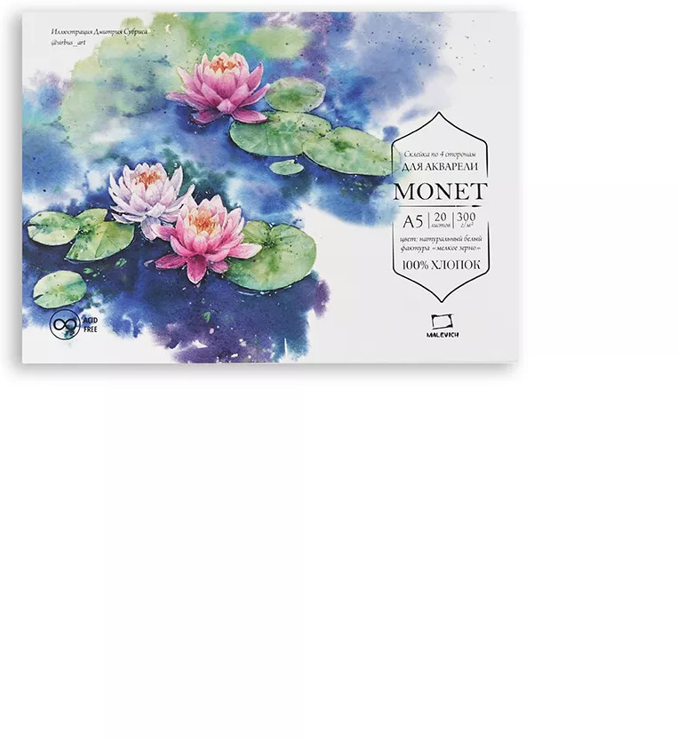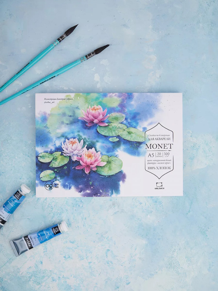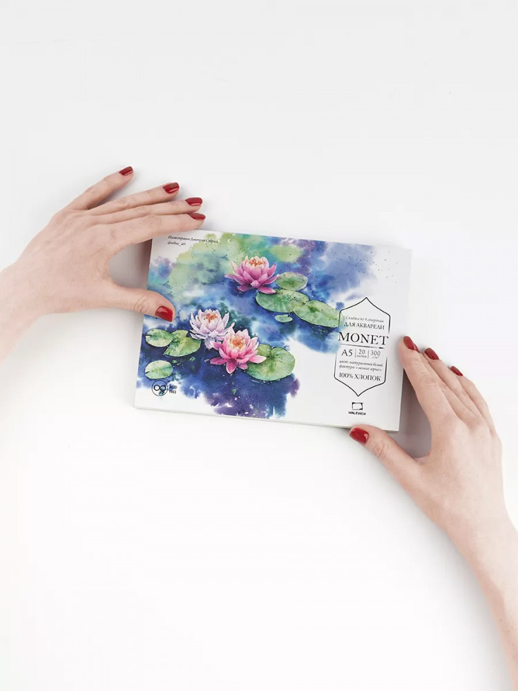 Бумага для акварели из 100% хлопка Моне — это классическая хлопковая бумага с присущими для хлопка свойствами. Она позволяет работать в технике по-мокрому, лист остается влажным и позволяет набирать тон постепенно. Плотность 300 г/кв.м позволяет бумаге держать воду и выравниваться после высыхания.
