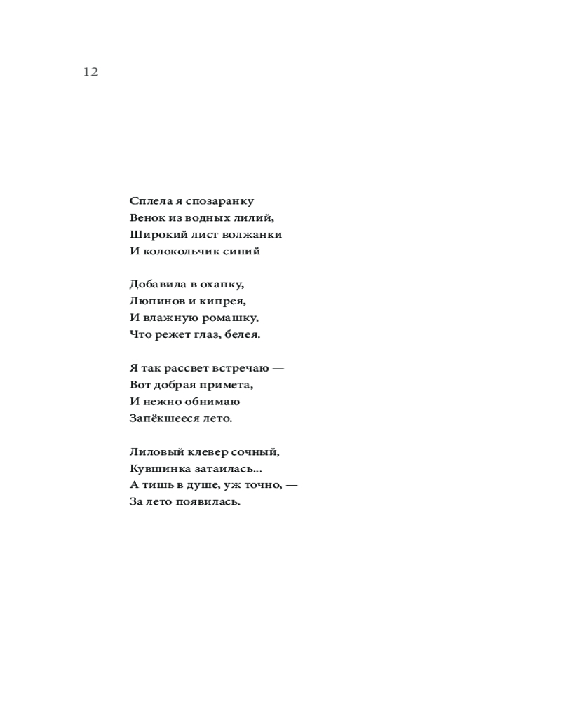 Серия: Поэты нашего времени. Лирика, меняющая сердца Стихи — это возможность взглянуть на многие привычные вещи под новым углом, поговорить на важные темы и иногда помечтать. Сборник «Цветы души» — это завораживающая трансформация мыслей автора в стихи, возможность посмотреть на мир ее глазами и почувствовать мир так, как чувствует она. На первый взгляд поэзия кажется легкой, но как только вы начнете читать — увидите, как глубок и откровенен каждый стих, насколько искренне автор размышляет о жизненных ориентирах и какой важный посыл вкладывает в каждую строчку. Загляните внутрь себя, осветите самые потаенные уголки своей души — и позвольте ей стать чуть светлее от соприкосновения с прекрасным. |