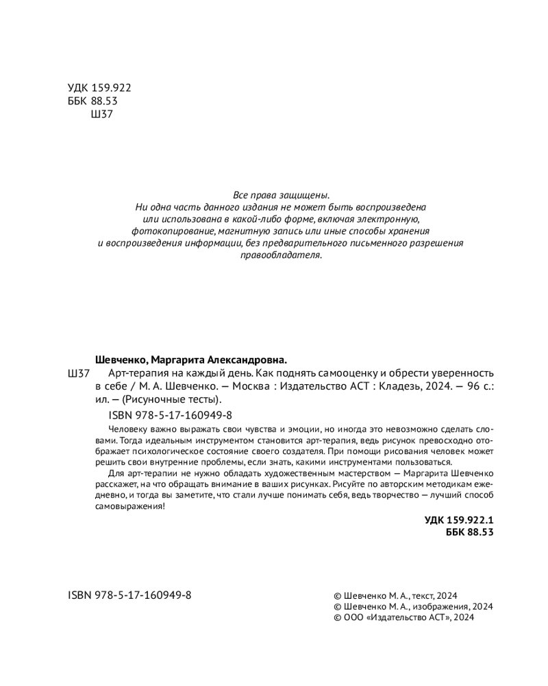 Серия: Рисуночные тесты Человеку важно выражать свои чувства и эмоции, но иногда это невозможно сделать словами. Тогда идеальным инструментом становится арт-терапия, ведь рисунок превосходно отображает психологическое состояние своего создателя. При помощи рисования человек может решить свои внутренние проблемы, если знать, какими инструментами пользоваться. Для арт-терапии не нужно обладать художественным мастерством — Маргарита Шевченко расскажет, на что обращать внимание в ваших рисунках. Рисуйте по авторским методикам ежедневно, и тогда вы заметите, что стали лучше понимать себя, ведь творчество — лучший способ самовыражения! |