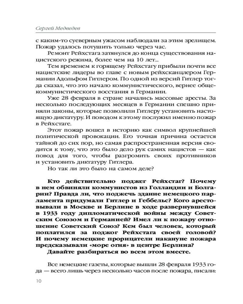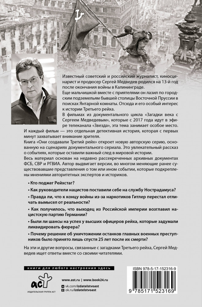 Серия: Загадки века с Сергеем Медведевым Книга «Они создавали Третий рейх» открывает авторскую серию Сергея Медведева, основанную на документальных сценариях одноименных телепередач. Это увлекательный рассказ о событиях, которые оставили важный след в мировой истории. Весь материал основан на недавно рассекреченных архивных документах ФСБ, СВР и РГВИА. Автор выдвигает версии, во многом меняющие ранее существующие представления о том или ином событии, которые подкреплены мнениями авторитетных экспертов и историков. |