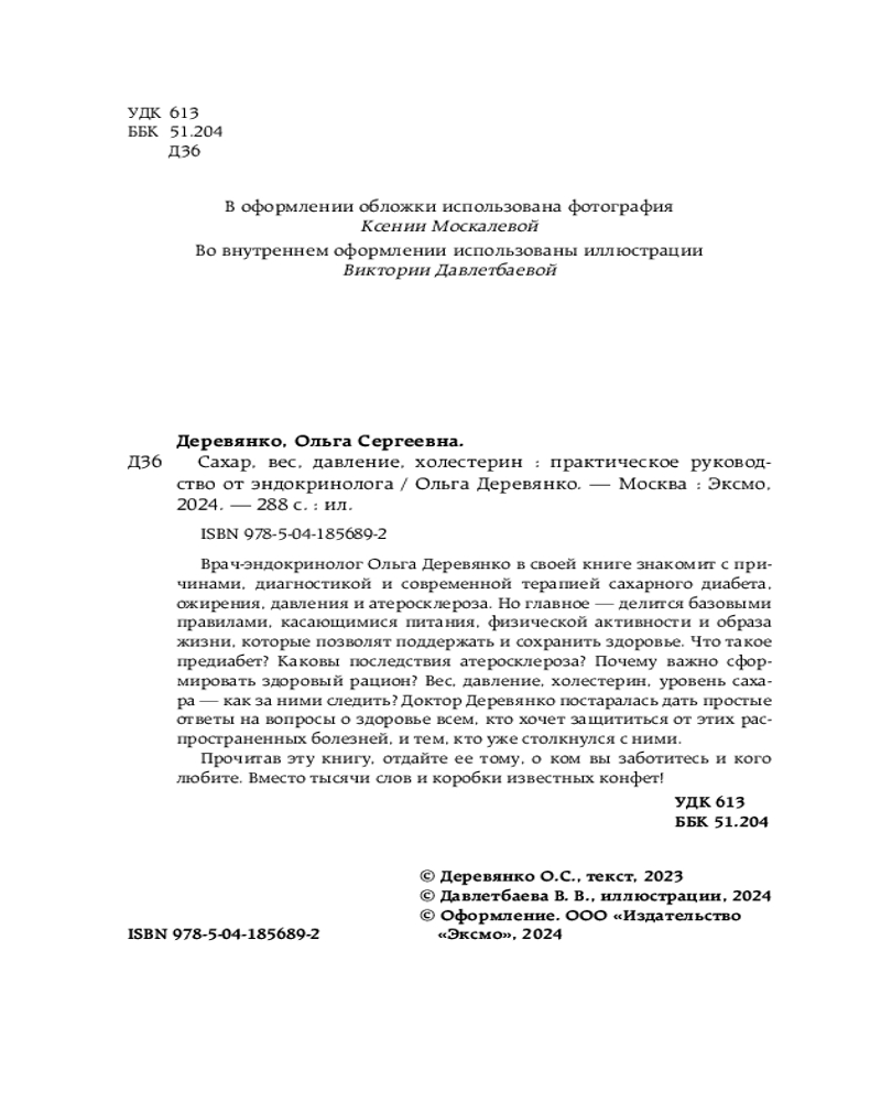 Серия: Книги эндокринолога Ольги Деревянко Сахарный диабет — заболевание, которое врачи называют пандемией XXI века, а лишний вес, повышенное давление и холестерин могут приводить к серьезным нарушениям и опасным последствиям. Книга врача-эндокринолога Ольги Деревянко объяснит, какие факторы провоцируют диабет, давление, ожирение, атеросклероз и в чем особенность этих недугов. Поможет разобраться, какие полезные изменения внести в свой образ жизни, чтобы обезопасить себя от них, и что делать, если вам уже поставили соответствующий диагноз. |