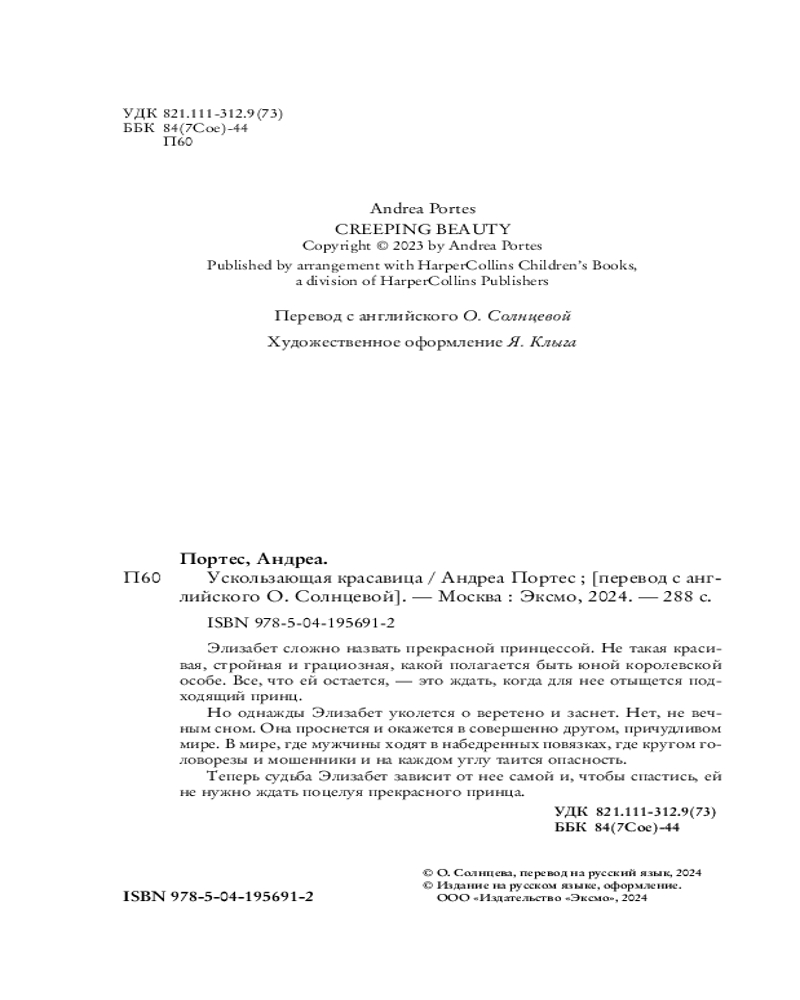 Серия: Young Adult. Уроки магии. Бестселлеры ромэнтези Элизабет сложно назвать прекрасной принцессой. Не такая красивая, стройная и грациозная, какой полагается быть юной королевской особе. Все, что ей остается — это ждать, когда для нее отыщется подходящий принц. Но однажды Элизабет уколется о веретено и заснет. Нет, не вечным сном. Она проснется и окажется в совершенно другом, причудливом мире. В мире, где мужчины ходят в набедренных повязках, где кругом головорезы и мошенники, и на каждом углу таится опасность. Теперь судьба Элизабет зависит от нее самой, и, чтобы спастись, ей не нужно ждать поцелуя прекрасного принца. |