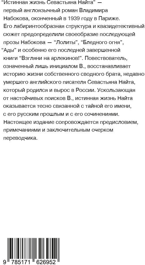 Серия: Набоковский корпус (мягкая обложка) «Истинная жизнь Севастьяна Найта» — первый англоязычный роман Владимира Набокова, оконченный в 1939 году в Париже и два года спустя опубликованный в США. Его лабиринтообразная структура и квазидетективный сюжет предопределили своеобразие последующей прозы Набокова — «Лолиты», «Бледного огня», «Ады» и особенно его последней завершенной книги «Взгляни на арлекинов!». |
