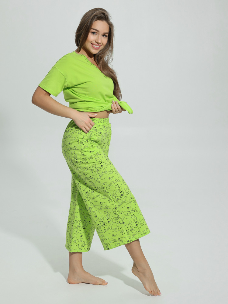 Модная пижама - это комфортная одежда для отдыха, которую по достоинству оценят. Набор состоит из широких штанов кюлотов с высокой посадкой и футболки с коротким рукавом. Удобные брюки на резинке на талии не стесняет движения.