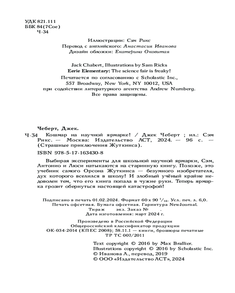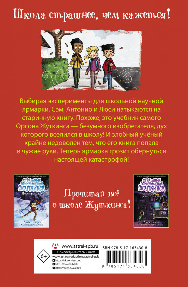 Серия: Страшные приключения Жуткинса Выбирая эксперименты для школьной научной ярмарки, Сэм, Антонио и Люси натыкаются на старинную книгу. Похоже, это учебник самого Орсона Жуткинса — безумного изобретателя, дух которого вселился в школу! И злобный учёный крайне недоволен тем, что его книга попала в чужие руки. Теперь ярмарка грозит обернуться настоящей катастрофой! |