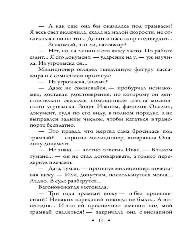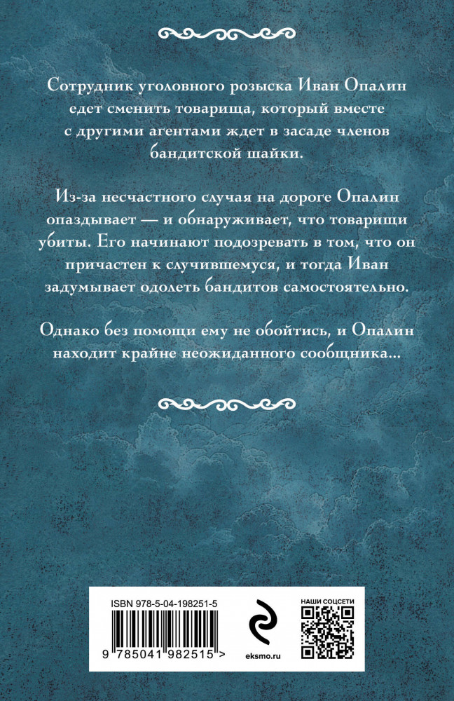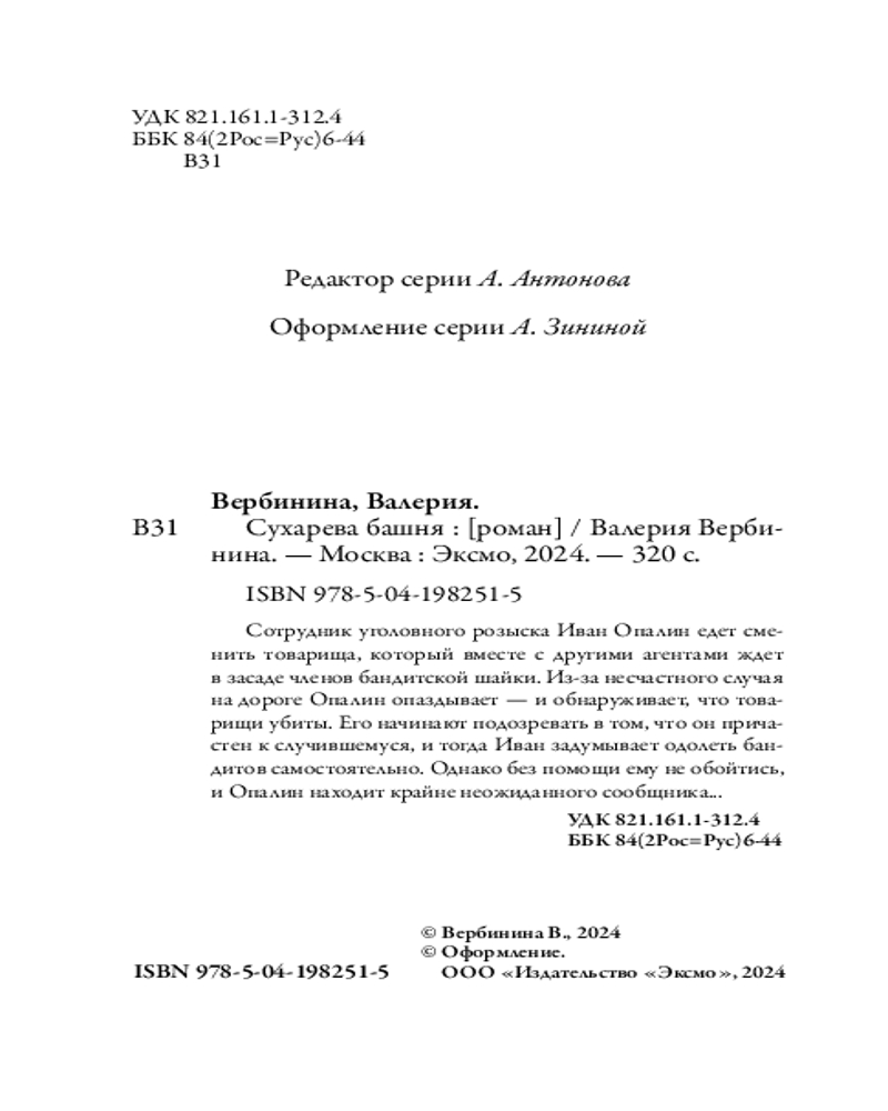 Сухарева башняВ данный момент этот товар отсутствует в продаже. Возможно, у нас найдется аналогичный или похожий товар здесь. Серия: Любовь, интрига, тайна. Новое оформление (обложка) Помощник агента уголовного розыска Иван Опалин, главный герой нового остросюжетного романа Валерии Вербининой «Сухарева башня», случайно стал свидетелем, как туманным вечером трамвай переехал женщину. Это задержало Ивана, и он опоздал сменить в засаде одного из товарищей, поджидавших знаменитого бандита Лариона Стрелка. Добравшись до места, Опалин нашел своих товарищей убитыми — их расстреляли бандиты. Хозяйка дома, подруга Стрелка Сонька, исчезла. Один из расстрелянных агентов, умирая, успел прошептать Опалину слово «арка». Товарищи подозревают, что Опалин был в сговоре с бандитами и нарочно опоздал, чтобы остаться в живых. Ивана отстраняют от этого дела и дают ему другое — о смерти женщины под трамваем, а также приставляют к нему наблюдение. Опалин начинает самостоятельные поиски Стрелка и параллельно ведет два расследования... |