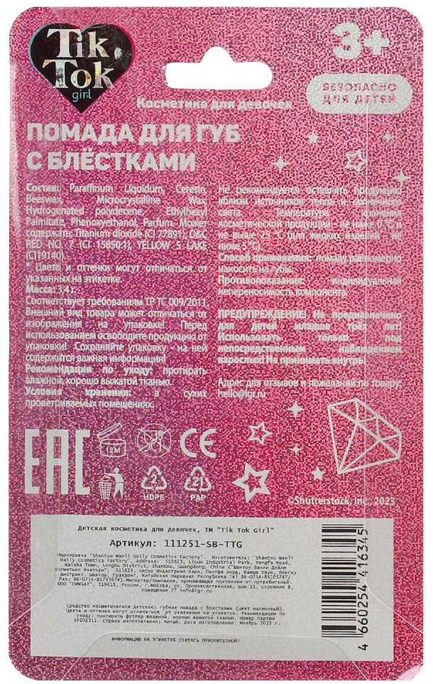 Tik Tok Girl Помада для губ с блёстками, тон розовыйВ данный момент этот товар отсутствует в продаже. Возможно, у нас найдется аналогичный или похожий товар здесь. Помада для губ с блёстками ТМ «Tik Tok Girl» непременно понравится маленькой моднице. Девочки в любом возрасте хотят быть красивыми. Специально для юных модниц была разработана эта сверкающая помада для губ. Маленькая принцесса обязательно оценит красивый цвет, волшебный блеск и модную упаковку. Развивайте чувство стиля и вкуса, учите девочку создавать свой неповторимый образ вместе с косметикой ТМ «Tik Tok Girl». |