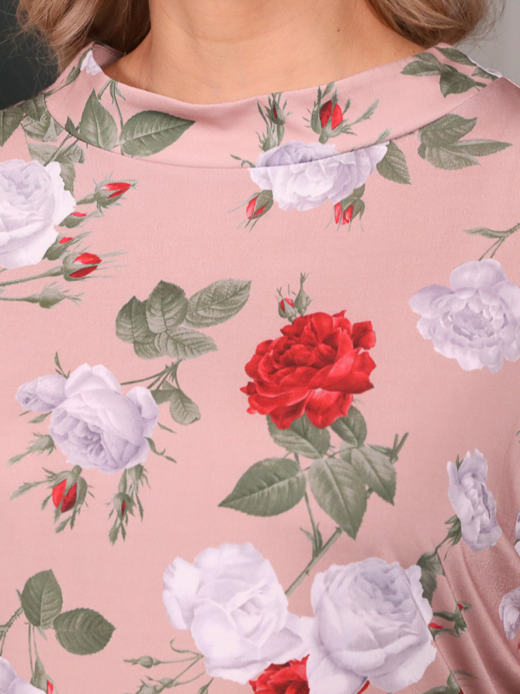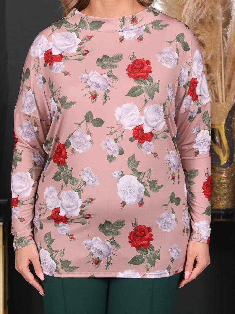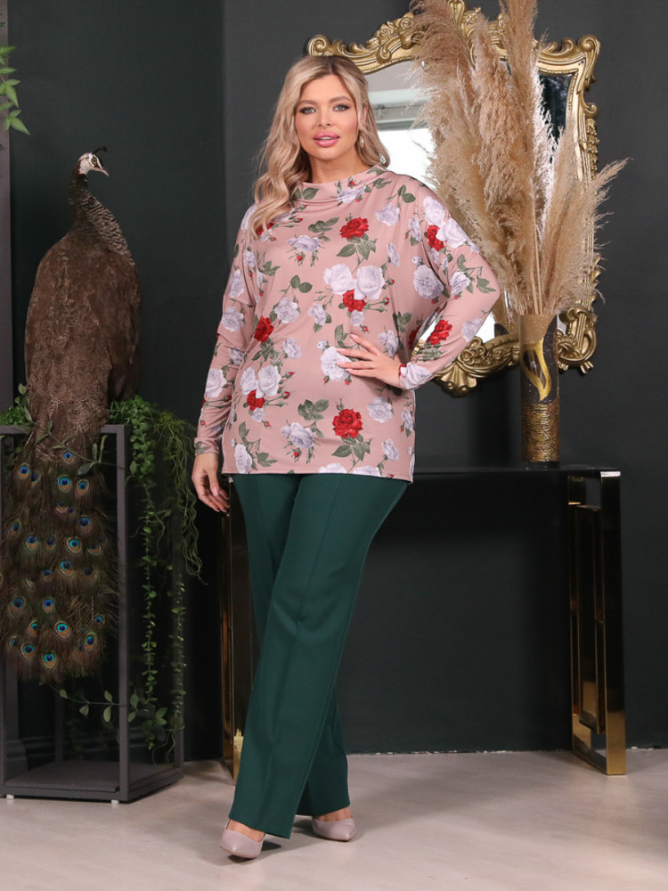 Стильный джемпер полуприлегающего силуэта из трикотажного полотна бежевого цвета с цветочным принтом. Изделие с воротником «полустойка» и втачными рукавами со спущенной линией проймы.