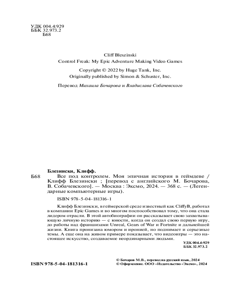 Серия: Легендарные компьютерные игры Клифф Блезински — или CliffyB, как он известен среди геймеров, — разработчик Unreal и Gears of War. Он один из немногих гейм-дизайнеров, кто достиг мифического статуса рок-звезды. В этой автобиографии он без утайки рассказывает свою захватывающую личную историю, которая идет рука об руку с развитием индустрии видеоигр.