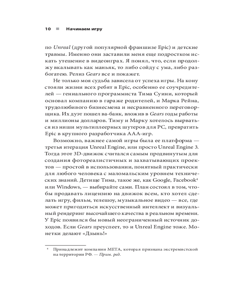 Блезински создал первую игру еще до окончания средней школы, а в семнадцать присоединился к молодой компании под названием Epic Games, где его ждали изнурительные часы работы и реализация уникального творческого потенциала. Он подробно описывает, как Epic стала лидером отрасли — во многом благодаря его работе над франшизами Unreal и Gears of War (и его вкладу в игру Fortnite). Вы узнаете, как из застенчивого прыщавого интроверта Блезински превратился в знаменитость за рулем спортивного автомобиля. Книга пронизана юмором, но при этом рассуждает о проблемах, с которыми давно сталкивается игровое сообщество. Это по-настоящему вдумчивые и вдохновляющие мемуары, которые на живом примере покажут вам, что игры — это настоящий вид искусства и насколько неординарные люди их создают.