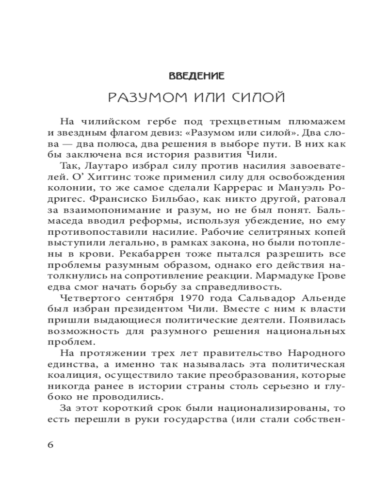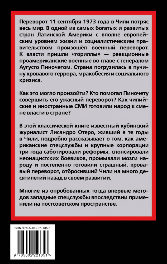 Серия: Мятежи и перевороты XX века Переворот 11 сентября 1973 года в Чили потряс весь мир. В одной из самых богатых и развитых странах Латинской Америки со вполне европейским уровнем жизни и социалистическим правительством произошёл военный переворот. К власти пришли «гориллы» — реакционные проамериканские военные во главе с генералом Аугусто Пиночетом. Страна погрузилась в пучину кровавого террора, мракобесия и социального кризиса. Как это могло произойти? Кто помогал Пиночету совершить его ужасный переворот? Как чилийские и иностранные СМИ готовили народ к смене власти в стране? |