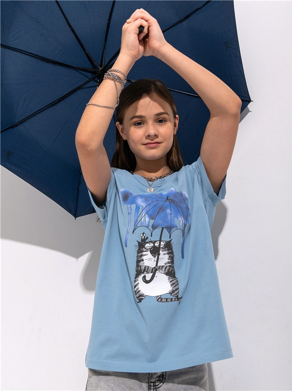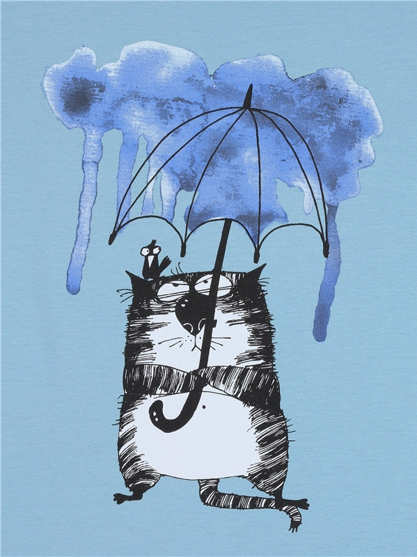 Футболка очень качественная. Хлопок. И милый котик под зонтом.