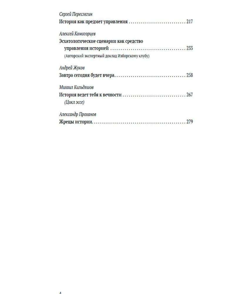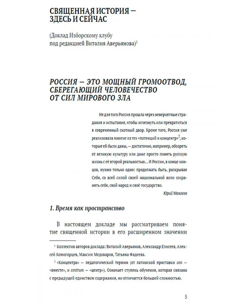 История не чтение для досужего обывателя, не фильм, который мы с любопытством или со скукой смотрим. История — это война, на которую мы призваны. Авторы трудов Изборского клуба объясняют наиболее острые конфликты нынешнего исторического сознания тем, что идет жестокая битва за сакральное. Та интерпретация нашего прошлого и нашего цивилизационного «Я», которая в итоге победит, и определит будущие судьбы человечества.