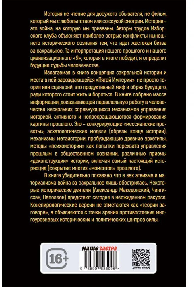 Излагаемая в книге концепция сакральной истории и места в ней зарождающейся «Пятой Империи» не просто теория или сценарий, это продуктивный миф и образ будущего, ради которого стоит жить и бороться. В книге собрано масса информации, доказывающей параллельную работу в человечестве нескольких соревнующихся механизмов управления историей, активного и непрекращающегося формирования картины прошлого. Это — конкурирующие «мессианские проекты», эсхатологические модели (образы конца истории), механизмы метаистории, пробуждающие древние архетипы, методы «психоистории» как попытки перехвата управления прошлым в общественном сознании, различные приемы «деконструкции» истории, включая самый настоящий историоцид (сокрытие многих «моментов» прошлого).