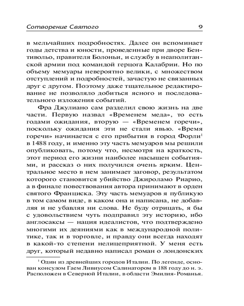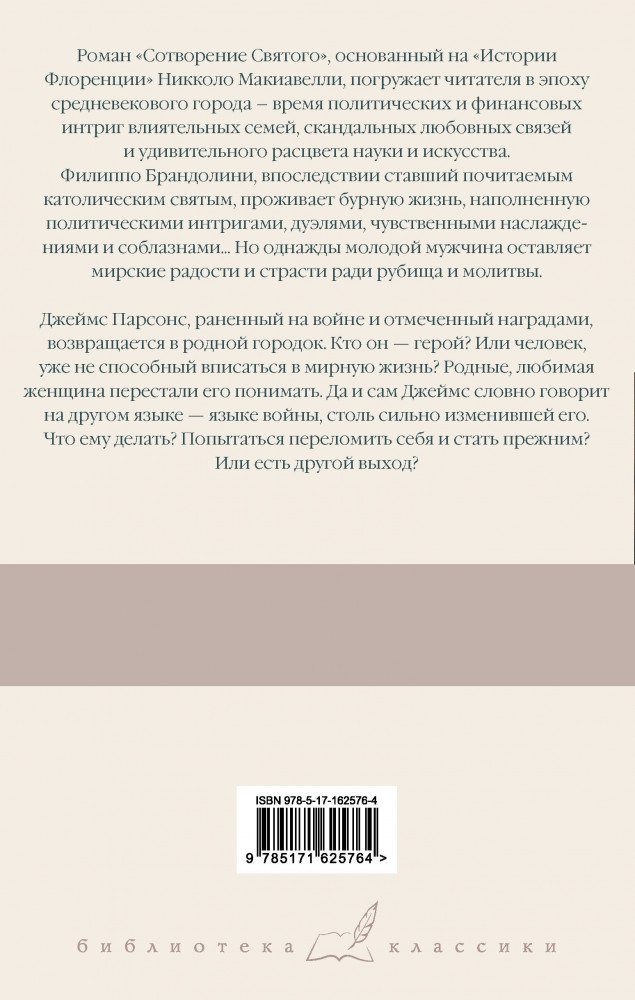 Серия: Библиотека классики Роман «Сотворение Святого», основанный на «Истории Флоренции» Никколо Макиавелли, погружает читателя в эпоху средневекового города — время политических и финансовых интриг влиятельных семей, скандальных любовных связей и удивительного расцвета науки и искусства. Филиппо Брандолини, впоследствии ставший почитаемым католическим святым, проживает бурную жизнь, наполненную политическими интригами, дуэлями, чувственными наслаждениями и соблазнами... Но однажды молодой мужчина оставляет мирские радости и страсти ради рубища и молитвы. |
