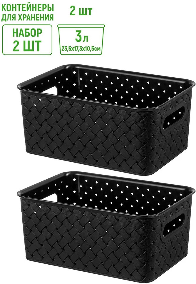 Набор из двух корзин по 3 литра с ручками можно разместить на кухне, в ванной, прихожей, офисе, гараже или в шкафу. Маленькие корзинки подойдут для бытовой химии, игрушек, одежды (для шапок, перчаток, белья, носков), канцелярии, косметики, украшений, рукоделия (для пряжи, вязания) и других мелочей. Коробки выполнены из пищевого полипропилена и украшены декоративными рельефными узорами с отверстиями для вентиляции. Полностью безопасны и подходят для продуктов. Используйте их для овощей, как хлебницы или фруктовые корзинки. Можно использовать как подарочные боксы: собрать наборы для мужчин и женщин, девушек и парней, мальчиков и девочек. Пластиковые корзины из серии «Береста» привлекательно выглядят и помогут создать систему для хранения вещей в едином стиле или гардеробную систему в вашей прихожей!