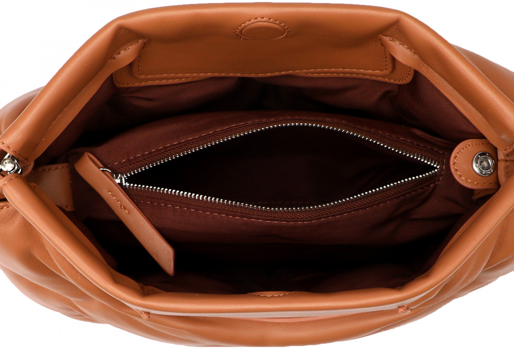 Сумка симпатичная, достаточно вместительная, кожа мягкая. На этом её достоинства и заканчиваются.Недостатки: нет отделения для телефона, внутри небольшой кармашек, который крепится кнопками к сумке. Что туда можно вкладывать, непонятно (маленький).Клапаны под замком открытые. Вся внутренность сумки видна, рука пролезет. Некрасиво. Да и для желающих пошарить в сумке доступ свободен.