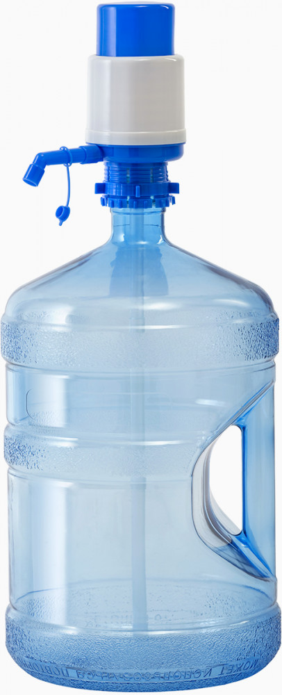 Легкая конструкция надевается на бутыль без снятия крышки — просто вставляется. Помпа хорошо накачивает воду, а для быстрой остановки подачи воды установлен удобный клапан, при нажатии на который вода перестает течь. |
