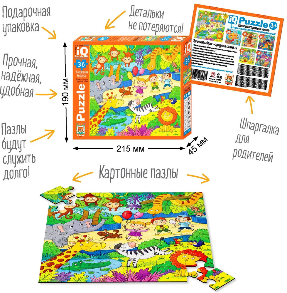Серия: IQ пазлы картонные Пазл с изображением животных зоопарка состоит из 36 элементов. Размер картинки 32×32 см. Материал идеально подходит для детских ручек. Большие детали выполнены из плотного толстого картона. Благодаря этому они ровно лежат, замки легко соединяются и хорошо держатся. По тактильным ощущениям малыш сразу понимает, правильно ли он собрал пазл. |
