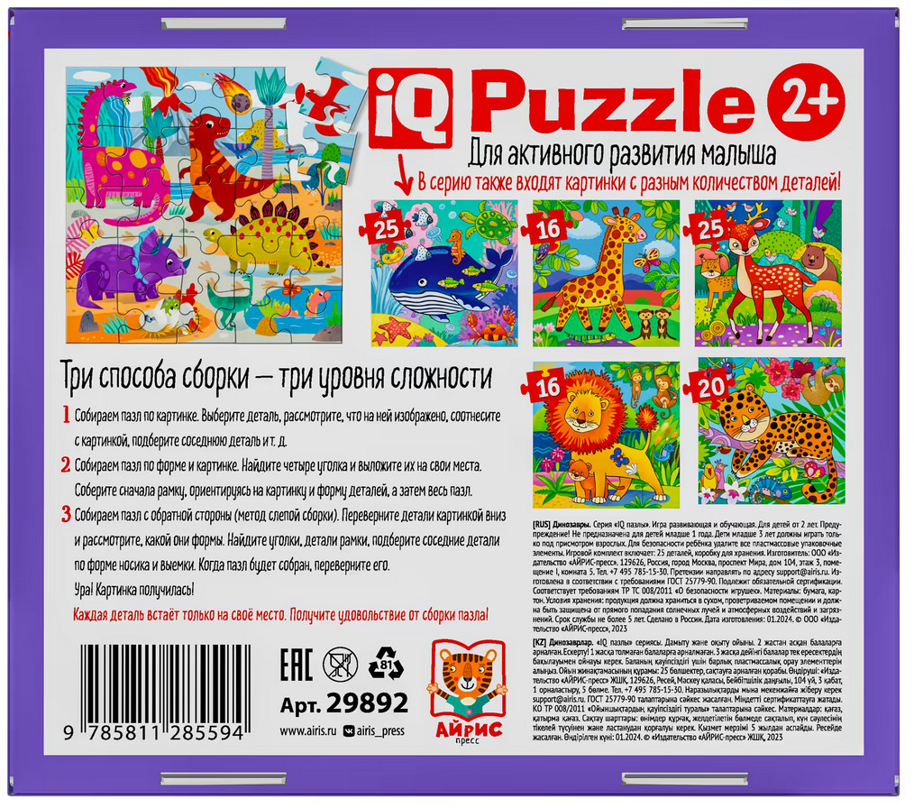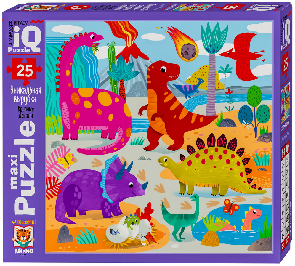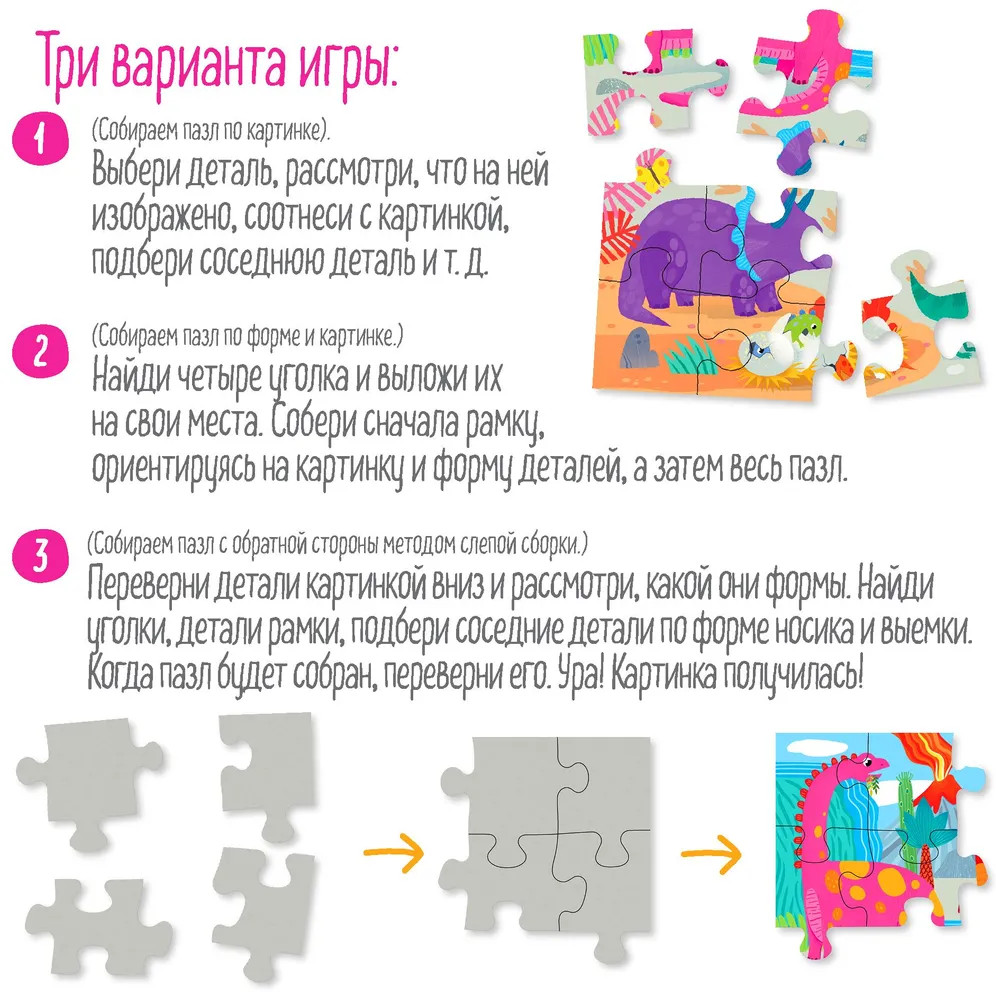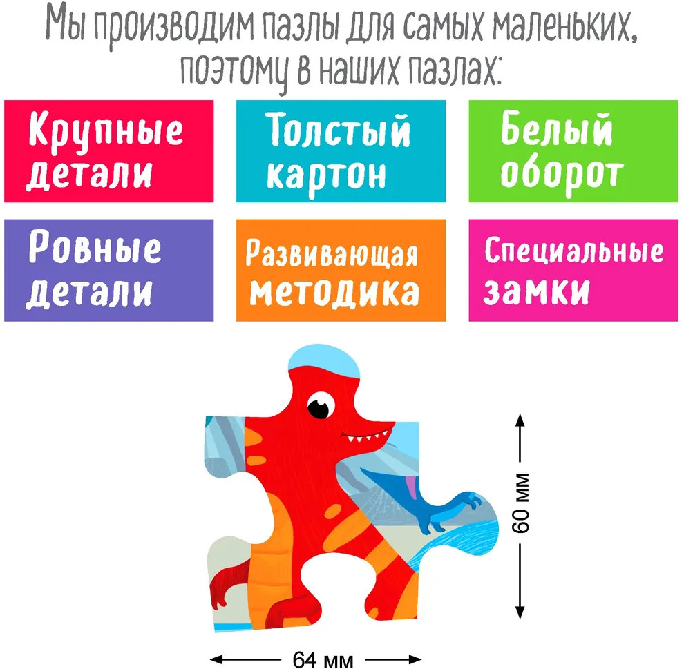 Пазл «Динозавры»В данный момент этот товар отсутствует в продаже. Возможно, у нас найдется аналогичный или похожий товар здесь. Серия: IQ пазлы картонные Пазл с изображением забавных динозавров состоит из 25 элементов. Размер картинки 32×32 см. Материал идеально подходит для детских ручек. Большие детали выполнены из плотного толстого картона. Благодаря этому они ровно лежат, замки легко соединяются и хорошо держатся. По тактильным ощущениям малыш сразу понимает, правильно ли он собрал пазл. |