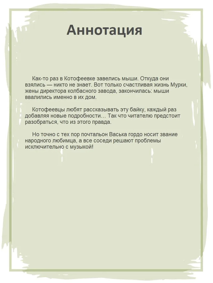 Серия: У нас в Котофеевке Как-то раз в Котофеевке завелись мыши. Откуда они взялись — никто не знает. Вот только счастливая жизнь Мурки, жены директора колбасного завода, закончилась: мыши ввалились именно в их дом. Котофеевцы любят рассказывать эту байку, каждый раз добавляя новые подробности... Так что читателю предстоит разобраться, что из этого правда. Но точно с тех пор почтальон Васька гордо носит звание народного любимца, а все соседи решают проблемы исключительно с музыкой! |