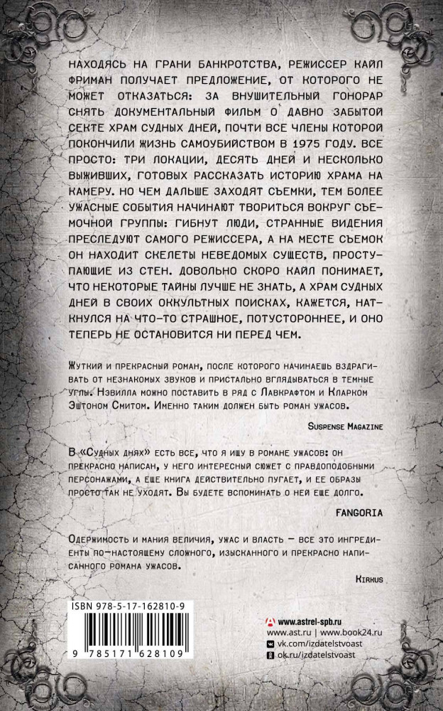 Серия: Мастера ужасов Находясь на грани банкротства, режиссер Кайл Фриман получает предложение, от которого не может отказаться: за внушительный гонорар снять документальный фильм о давно забытой секте Храм Судных дней, почти все члены которой покончили жизнь самоубийством в 1975 году. Все просто: три локации, десять дней и несколько выживших, готовых рассказать историю Храма на камеру. Но чем дальше заходят съемки, тем более ужасные события начинают твориться вокруг съемочной группы: гибнут люди, странные видения преследуют самого режиссера, а на месте съемок он находит скелеты неведомых существ, проступающие из стен. Довольно скоро Кайл понимает, что некоторые тайны лучше не знать, а Храм Судных дней в своих оккультных поисках, кажется, наткнулся на что-то страшное, потустороннее, и оно теперь не остановится ни перед чем. |