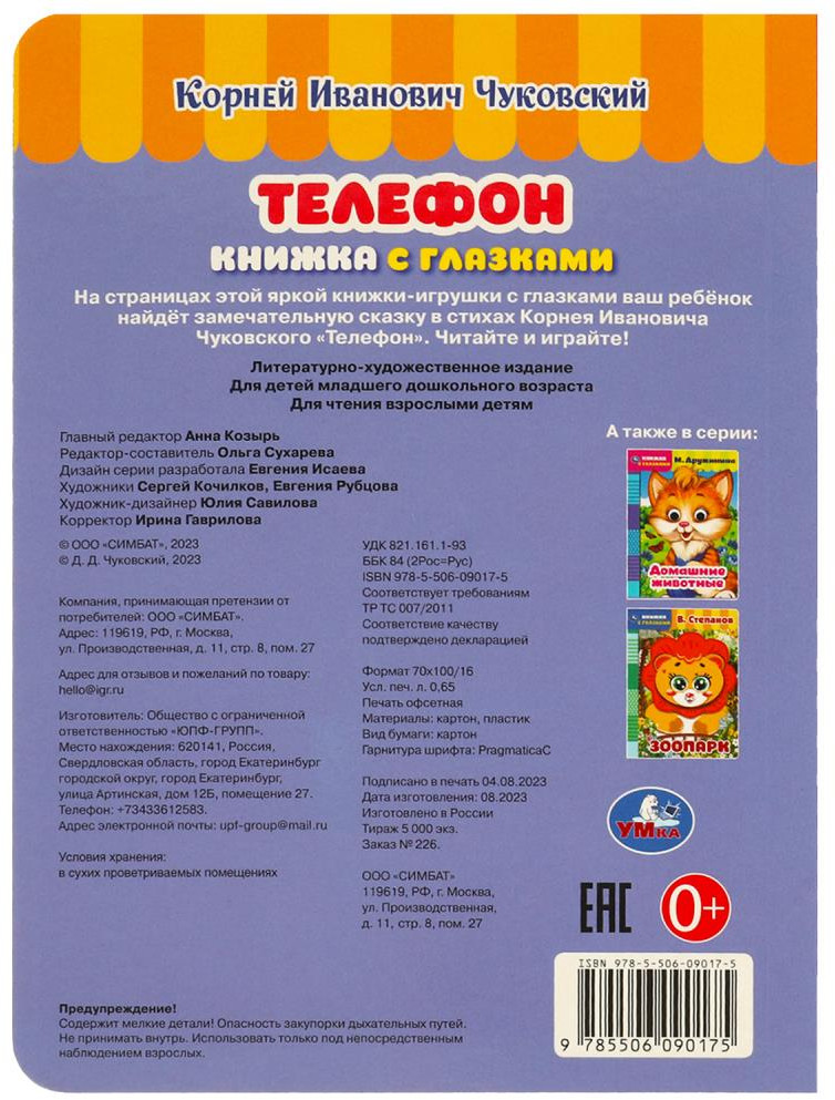 💳 Оплатить за товар можно при получении 🇰🇿 Есть бесплатная доставка по Казахстану 🎁 Копите бонусы с каждой покупки Серия: Книжка с глазками На страницах этой яркой книги малыша ждёт встреча с забавными героями сказки Корнея Чуковского. Увлекательная история сопровождается большими красочными картинками с подвижными глазками, благодаря которым персонажи выглядят совсем как живые. Компактный размер книги позволяет взять её с собой в путешествие. Чтение книги с глазками ТМ «УМка» и игра с ней развивают мелкую моторику, образное мышление, визуальное восприятие, внимание, память, речь. |