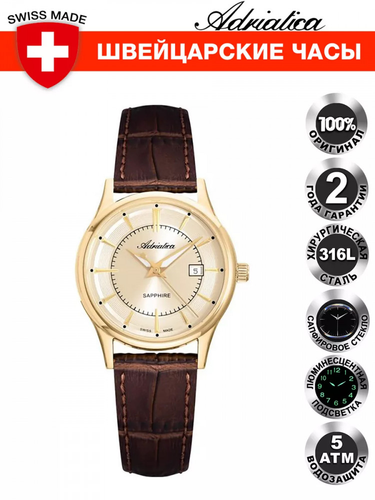 Adriatica Наручные часы A3196.1211QВ данный момент этот товар отсутствует в продаже. Возможно, у нас найдется аналогичный или похожий товар здесь. Классические женские наручные часы на кожаном ремешке. Присутствует апертура даты. Циферблат закрывает устойчивое к потертостям и царапинам сапфировое стекло. На стрелки нанесен светонакопительный состав. Швейцарский кварцевый механизм Ronda. |