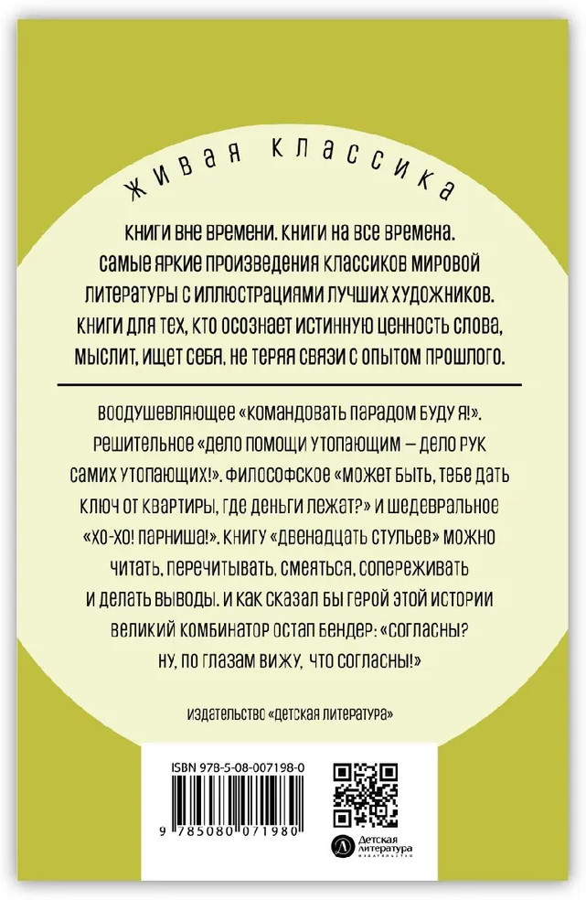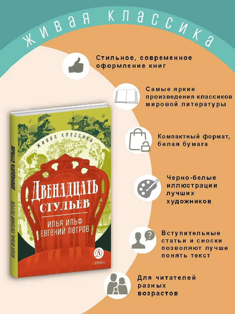 Серия: Живая классика Знаменитый сатирический роман конца 1920-х годов. В центре его — образ Остапа Бендера, обаятельного жулика, авантюриста, натуры артистической и независимой, с великолепным чувством юмора. По ходу сюжета, в погоне за бриллиантами, герой вольно или невольно становится разоблачителем многих уродливых явлений жизни и быта. Перед читателями проходит обширная галерея ярких сатирических персонажей: бюрократов, взяточников, демагогов, приспособленцев, которые во множестве расплодились в Стране Советов времен нэпа. |
