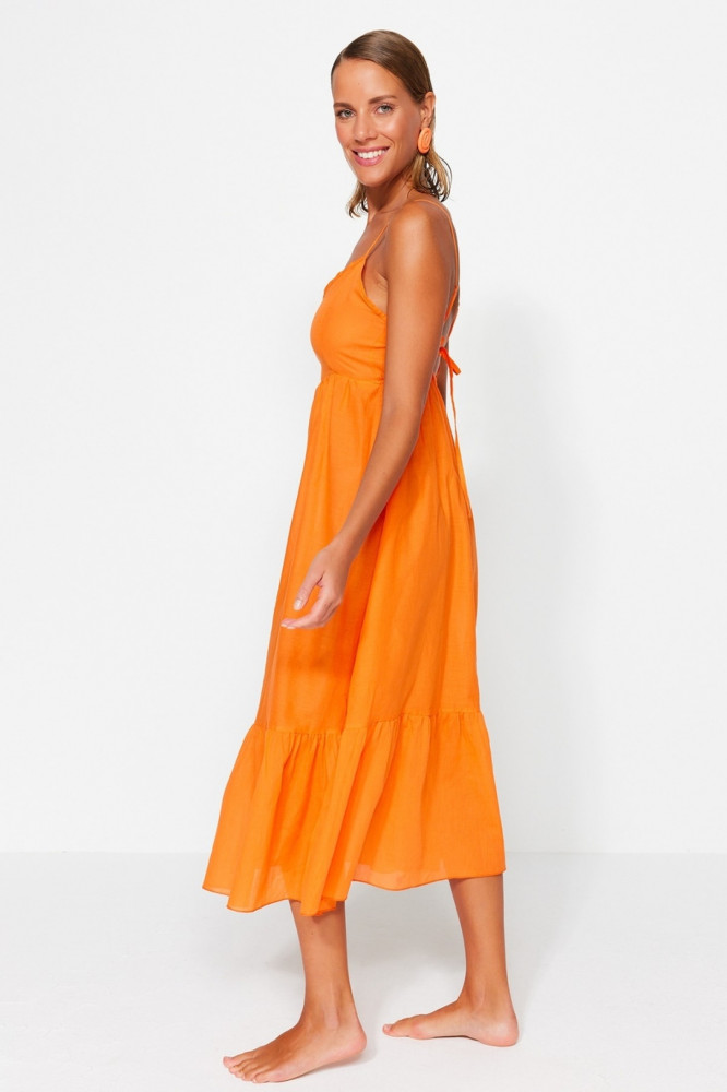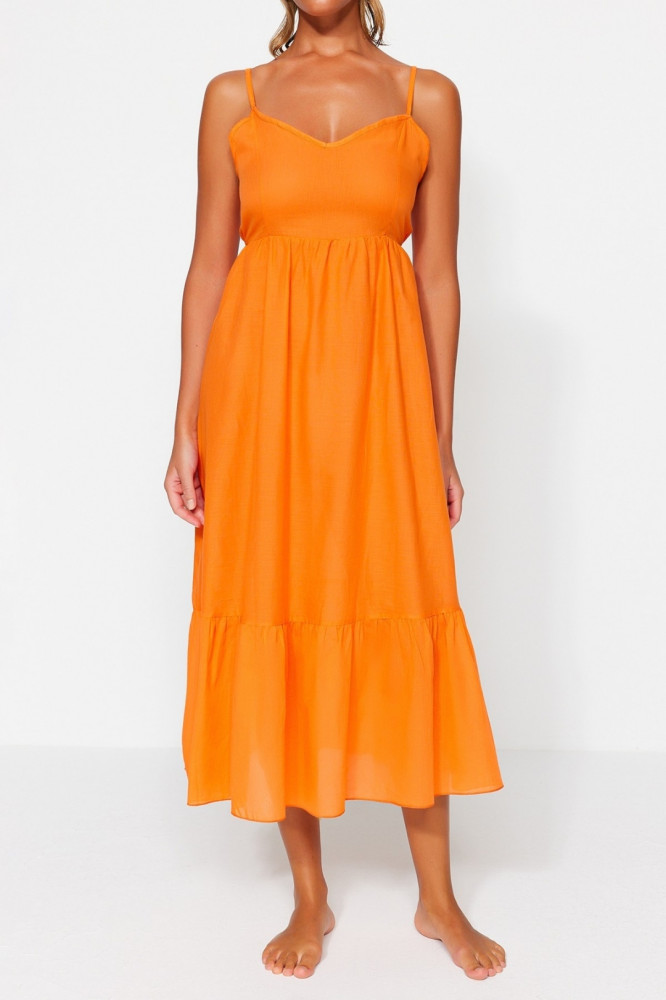 просвечивает трусы,бюстгальтер с ним не оденешь ( сзади спина открыта) либо оранжевое нижнее белье надо брать.