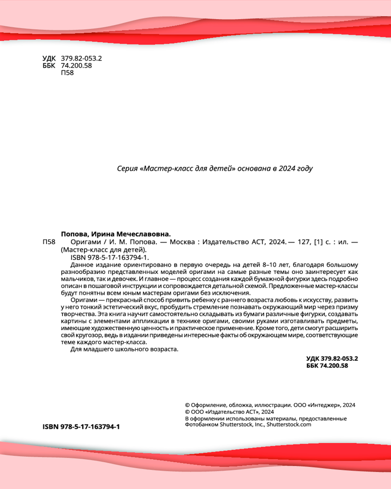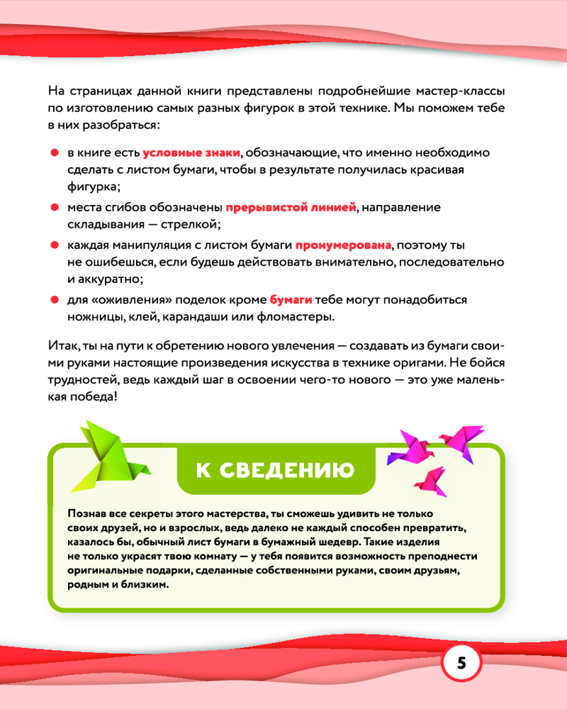 Серия: Мастер-класс для детей Данное издание ориентировано в первую очередь на детей 8–10 лет, благодаря большому разнообразию представленных моделей оригами на самые разные темы оно заинтересует как мальчиков, так и девочек. И главное — процесс создания каждой бумажной фигурки здесь подробно описан в пошаговой инструкции и сопровождается детальной схемой. Представленные мастер-классы будут понятны всем юным мастерам оригами без исключения. Оригами — прекрасный способ привить ребенку с раннего возраста любовь к искусству, развить у него тонкий эстетический вкус, научить познавать окружающий мир через призму творчества. Эта книга научит его самостоятельно складывать из бумаги различные фигурки, создавать картины с элементами аппликации в технике оригами, своими руками изготавливать предметы, имеющие художественную ценность и практическое применение. Кроме того, дети смогут расширить свой кругозор, ведь в издании приведены интересные факты об окружающем мире, соответствующие теме каждого мастер-класса. Для младшего школьного возраста. |