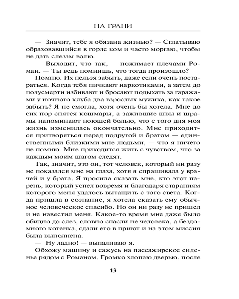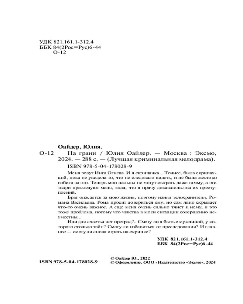 Серия: Лучшая криминальная мелодрама Меня зовут Инга Огнева. И я скрипачка... Точнее, была скрипачкой, пока не увидела то, что не следовало видеть, и не была жестоко избита за это. Теперь мои пальцы не могут сыграть даже гамму, а эти твари преследуют меня, зная, что я прячу доказательства их преступлений. Брат опасается за мою жизнь, поэтому нанял телохранителя, Романа Васильева. Рома просит довериться ему, но сам явно скрывает что-то очень важное. А еще меня очень сильно тянет к нему, и это тоже проблема, потому что чувства в моей ситуации совершенно неуместны... Или для счастья нет преград?.. Смогу ли я быть с мужчиной, у которого столько тайн? Смогу ли избавиться от преследования? И главное — смогу ли снова играть на скрипке? |