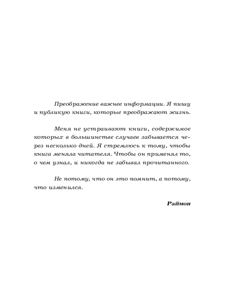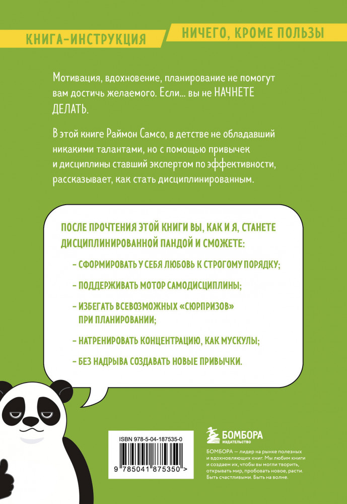Серия: Проблема-решение. Книги-инструкции для саморазвития Правильная атмосфера, мотивация, особые условия — не помогут вам достичь желаемого. Если... вы не начнете делать. В этой книге Раймон Самсо, в детстве не обладавший никакими талантами, но с помощью привычек и дисциплины ставший экспертом по эффективности, рассказывает, как стать дисциплинированным. |