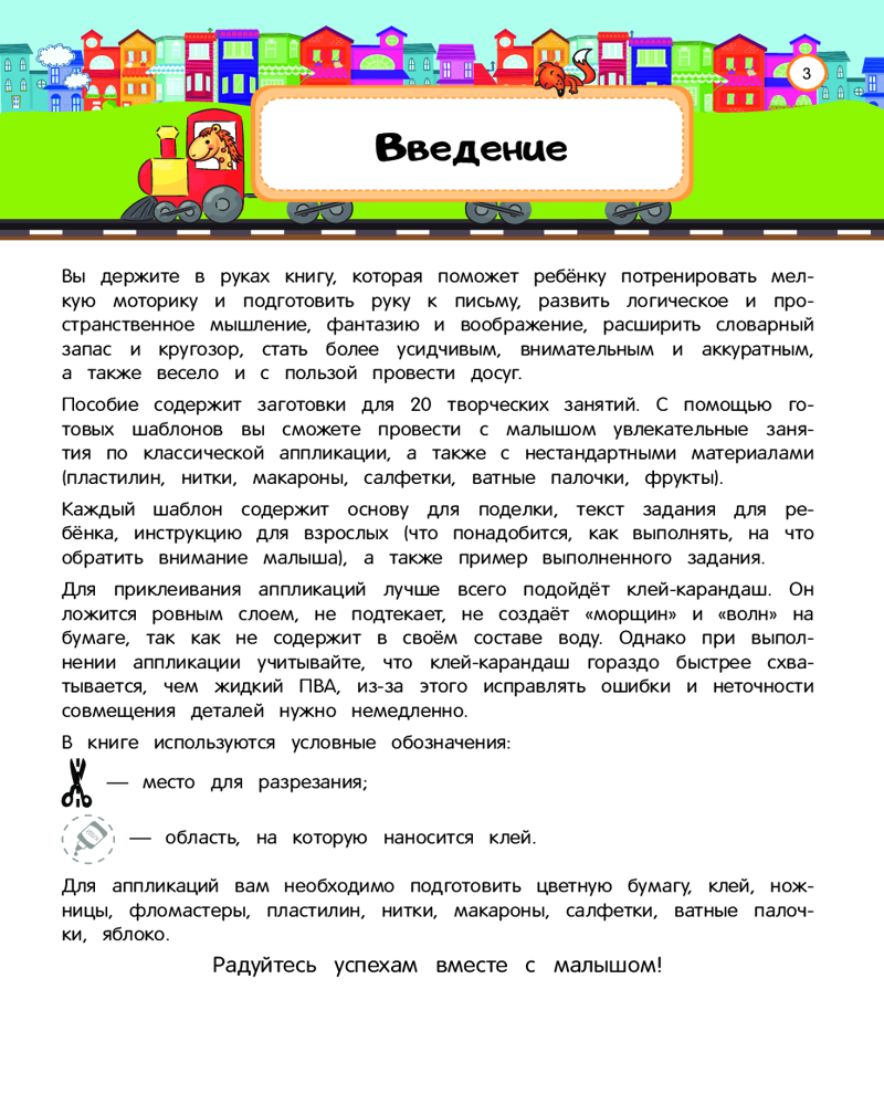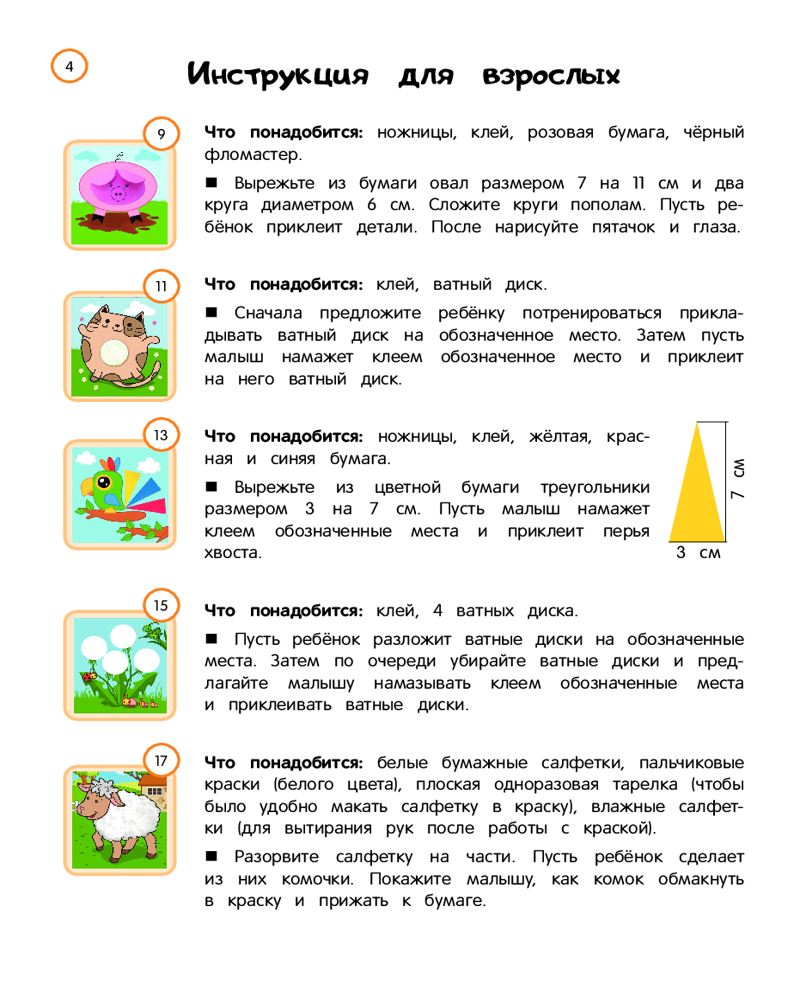 Аппликации-вырезалки для детей 3-4 летВ данный момент этот товар отсутствует в продаже. Возможно, у нас найдется аналогичный или похожий товар здесь. Серия: Аппликации-вырезалки для дошколят Аппликация-вырезалка поможет ребёнку развить творческие способности и станет хорошей альтернативой гаджетам. Благодаря интересным сюжетам и постепенно усложняющимся заданиям ребёнок разовьёт мелкую моторику, логическое и пространственное мышление, фантазию, внимание, воображение, подготовит руку к письму, расширит словарный запас и кругозор. Кроме того, занимаясь, малыш научится пользоваться ножницами и клеем. Все эти навыки помогут малышу почувствовать уверенность в своих силах, ведь ситуация успеха очень важна в обучении ребёнка. Пособие содержит заготовки для 20 творческих занятий. С помощью готовых шаблонов можно провести с малышом увлекательные занятия по классической аппликации, а также с нестандартными материалами (нитки, макароны, салфетки, ватные палочки, фрукты). Каждый шаблон содержит основу для поделки, текст задания для ребёнка, инструкцию для взрослых (что понадобится, как выполнять, на что обратить внимание малыша), а также пример выполненного задания. В конце книги ребёнка ожидает сюрприз — диплом за старание и выполнение всех заданий. |
