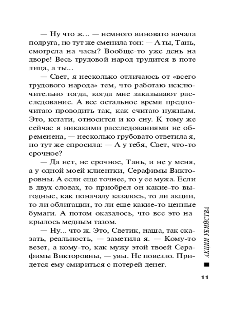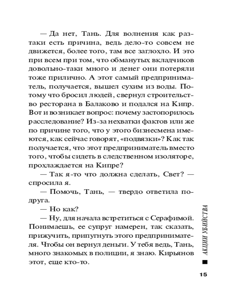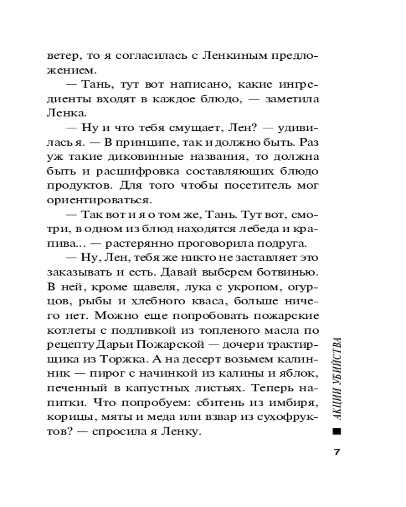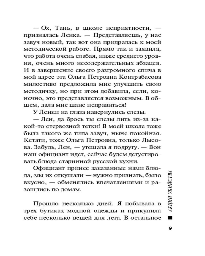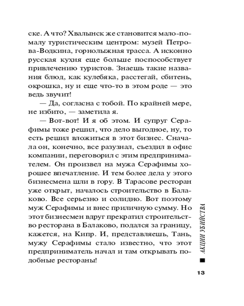 | Акции убийстваВ данный момент этот товар отсутствует в продаже. Возможно, у нас найдется аналогичный или похожий товар здесь. Серия: Русский бестселлер (обложка) Частный детектив Татьяна Иванова наслаждалась прекрасной русской кухней в ресторане «Былина» и даже не подозревала, что вскоре ей придется расследовать убийство его хозяина. Иннокентия Новостроевского убили в роскошном номере отеля, где он отдыхал с представительницами древнейшей профессии. Его отравили сильнодействующим препаратом, и теперь Татьяна Иванова ищет, кто виновен в смерти ресторатора... |