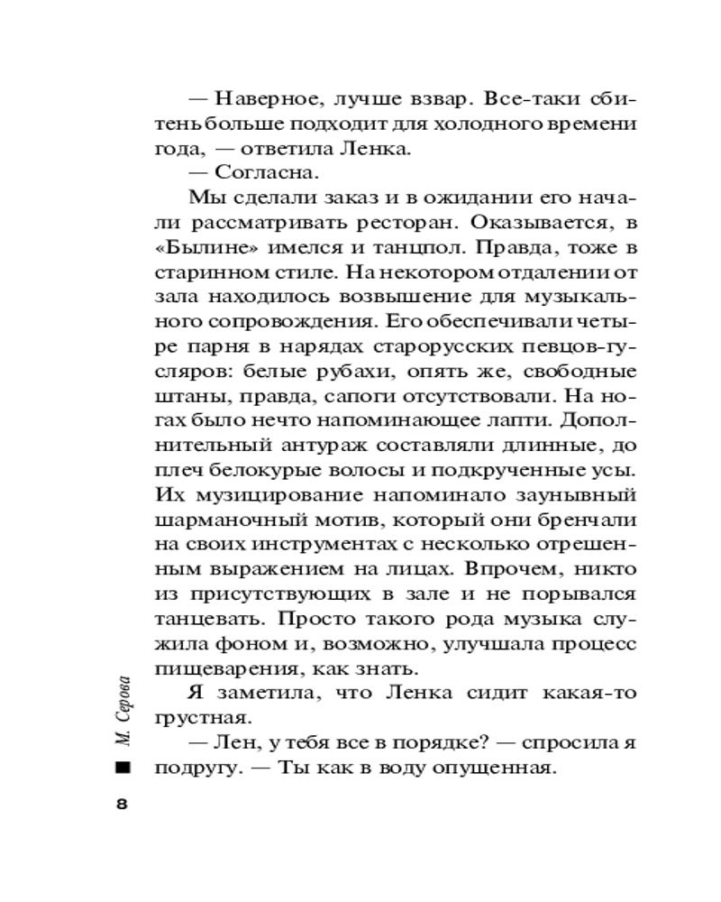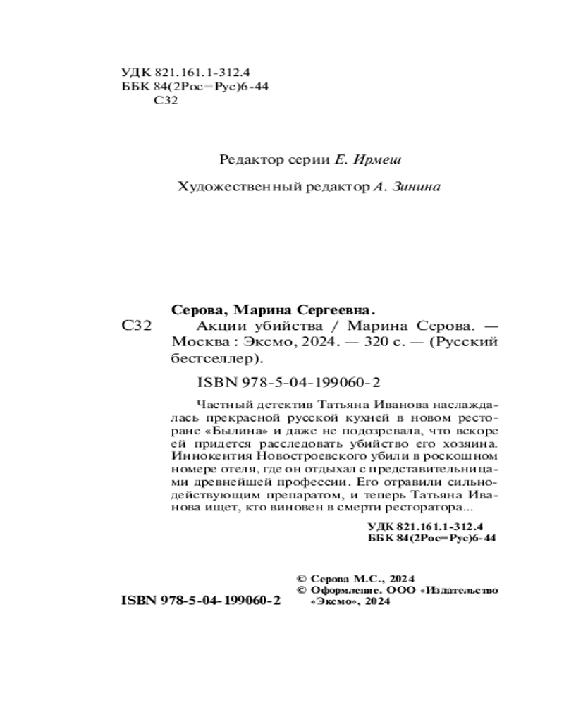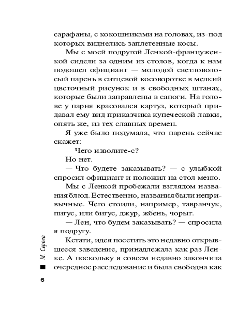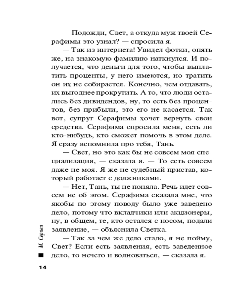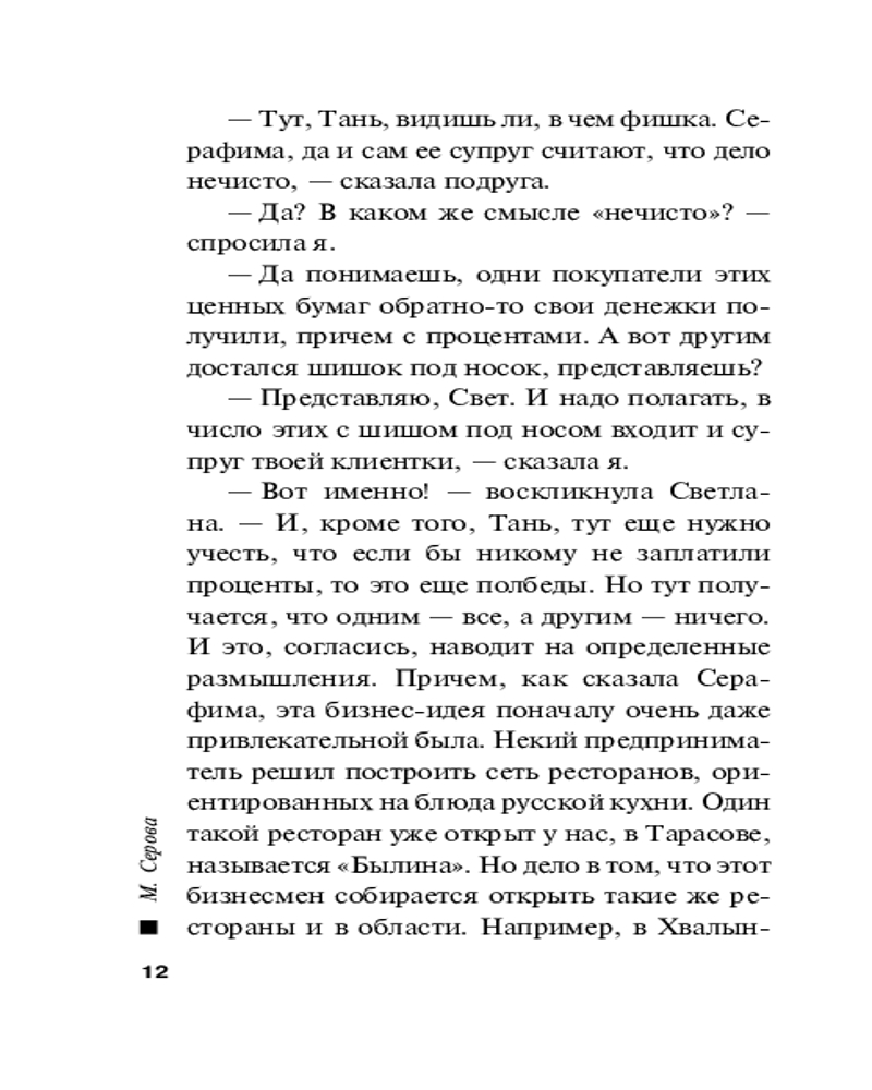 | Марина Сергеевна Серова — один из ведущих авторов серии современного русского детективного жанра (существует версия, что это коллектив авторов под общим руководством литературного агента Сергея Потапова). Согласно легенде, «выпускница юридического факультета МГУ, работала в Генеральной прокуратуре, сотрудница одной из спецслужб, участвовала в боевых операциях». Между тем написала 425 произведений размером порядка 200 страниц (и число их постоянно увеличивается). Часть произведений... |